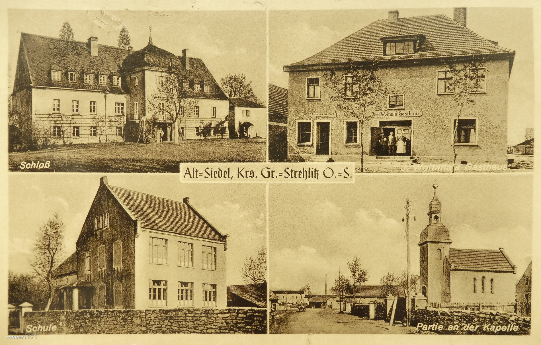 Lata 1940-1944 , Czteropolowa pocztówka z Siedlca(1936-1945 Alt Siedel) przedstawiająca nieistniejący pałac rodziny von Strachwitz, gospodę J. Woitalli, szkołę wiejską i część wsi z kaplicą.Skomentuj zdjęcie |