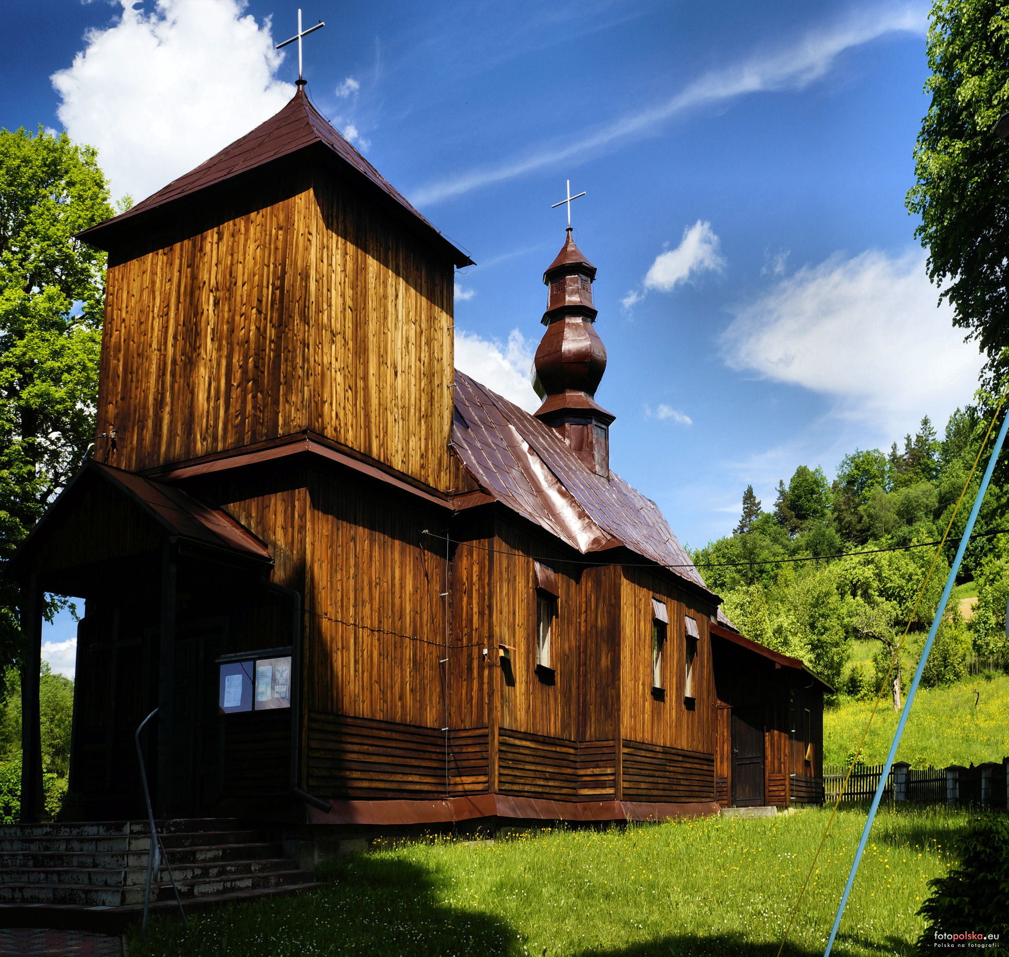 0 pobrań 447 odsłon 6 średnia ocen Poprzednie i następne zdjęcia JureK Obiekty widoczne na zdjęciu Kościół Matki Bożej Nieustającej Pomocy więcej zdjęć (17) Zbudowano: 1843-1844 Dawniej: Cerkiew Opieki Najświętszej Maryi Panny Zabytek: A-77 z 31.01.1985 Dawna, drewniana filialna cerkiew greckokatolicka Opieki NMP, zbudowana w latach 1843-1844, w miejscu starszej drewnianej cerkwi. Należała do parafii w Uhercach Mineralnych. W 1869 zmieniono wezwanie cerkwi z Opieki NMP (czasem Ucieczki do Egiptu) na Soboru NMP. Cerkiew jest orientowana, konstrukcji zrębowej. Obok znajduje się cmentarz cerkiewny, obecnie już pozbawiony nagrobków, otoczony starymi drzewami. Po 1947 użytkowana była jako magazyn zboża. Około 1970 zachowany był jeszcze kompletny ikonostas z XIX w oraz kilka starszych ikon z XVII – XVIII w. W 1971 cerkiew została przejęta przez kościół rzymskokatolicki (parafia w Uhercach Mineralnych), aktualnie jest to kościół pw. Matki Bożej Nieustającej Pomocy. W 1976 nastąpiła kradzież większości wyposażenia, a ostatnie 3 ikony sprzedano Muzeum Historycznemu w Sanoku. Ikonostas pozbawiony ikon przecięty został na trzy części. Środkową przesunięto w głąb prezbiterium i ustawiono ok. 1.5 m od tylnej ściany tworząc w ten sposób małą zakrystię. W nawie głównej XIX – wieczna polichromia z przedstawieniem św. Trójcy. (źródło : wikipedia ) |