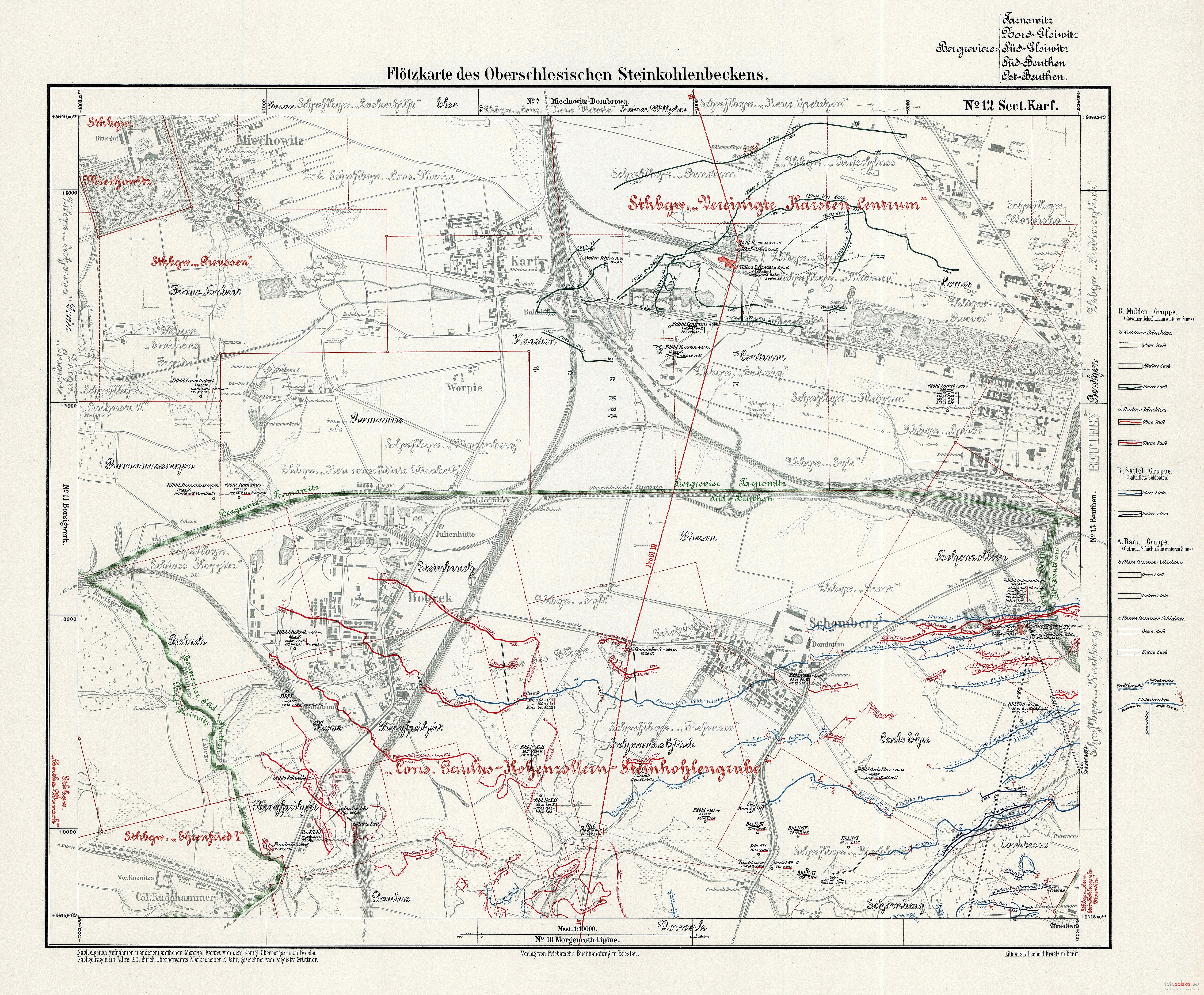 Lata 1900-1901 , Mapa górnicza okolic Bytomia (dzielnice zachodnie: Karb, Miechowice, Bobrek, Szombierki). Źródło:Skomentuj zdjęcie |