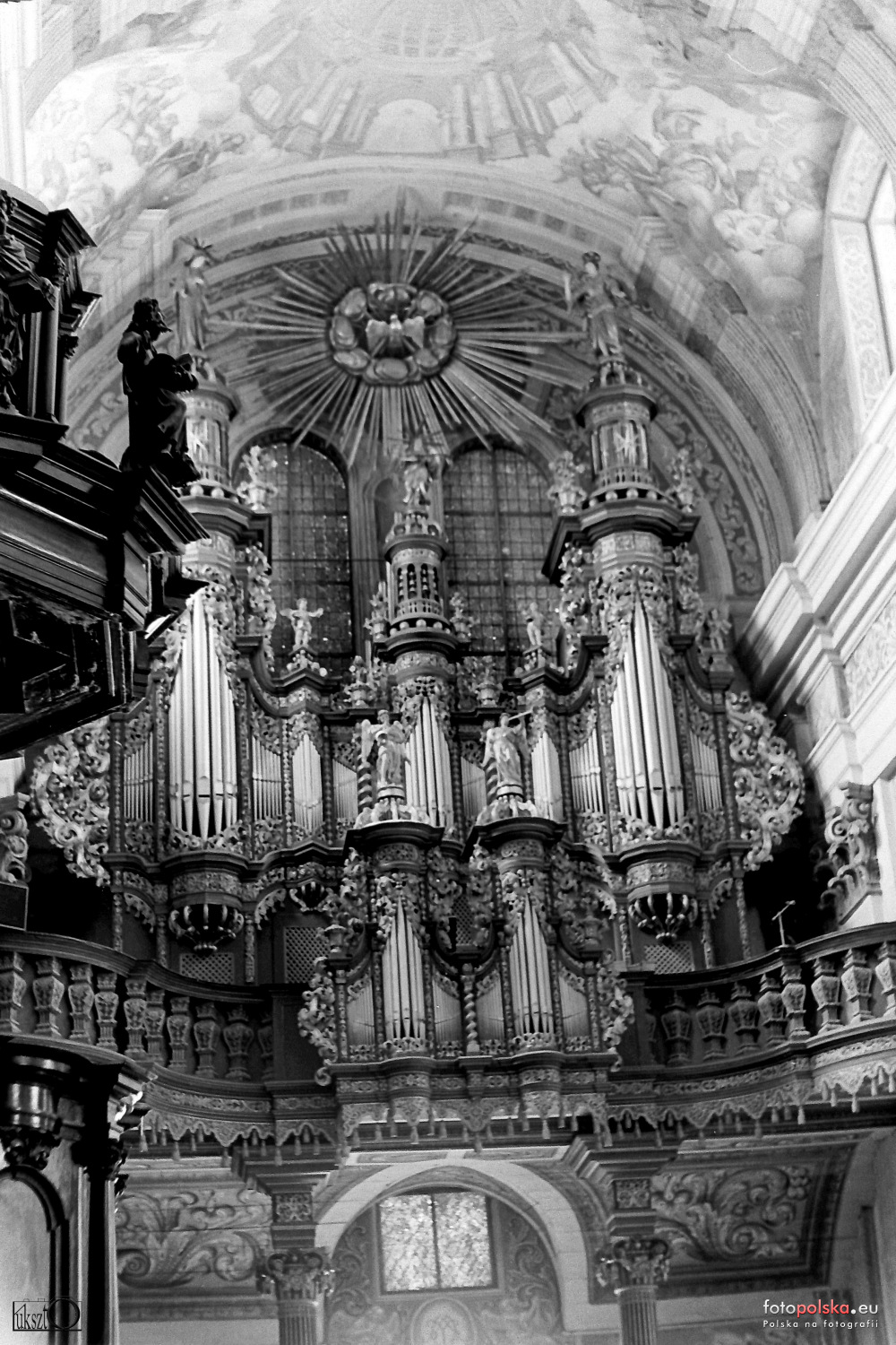 0 pobrań 360 odsłon 6 średnia ocen Poprzednie i następne zdjęcia Łukszto Obiekty widoczne na zdjęciu Prospekt organowy więcej zdjęć (17) Wnętrza bazyliki więcej zdjęć (56) Bazylika Nawiedzenia Najświętszej Maryi Panny więcej zdjęć (166) Atrakcja turystyczna Wzniesienie obecnego kościoła nastąpiło z inicjatywy jezuitów w latach 1688-1693 wg projektu nieznanego architekta, a fasada została ukończona w roku 1730. Budowę kościoła realizował Jerzy Ertli z Wilna. Przed rozpoczęciem budowy trzeba było ustabilizować grunt, przez wbicie weń 10 000 pali z drewna olchowego, ponieważ plac budowy wchodził na bagnisty teren między jeziorem Wirowym i Dejnowa. Kościół ma formę trójnawowej bazyliki z dwuprzęsłowym prezbiterium, czteroprzęsłowym korpusem nawy głównej i emporami nad nawami bocznymi. Kościół jest otoczony przez czworoboczny krużganek odpustowy, z kaplicami narożnymi. Na fasadzie kościoła, przednich kaplic oraz frontowym ramieniu krużganka ustawiono rzeźby dłuta rzeźbiarza Krzysztofa Perwangera. Wnętrze kościoła jest bogato dekorowane, m.in. malowidłami na sklepieniu z lat 1722-1727, autorstwa Macieja Jana Meyera. Sklepienie prezbiterium i nawy głównej (poczynając od prezbiterium) ozdobione jest ilustracjami do zawołań litanii loretańskiej – od Królowej Aniołów do Królowej Wyznawców. Ci ostatni są umieszczeni na sklepieniu ostatniego przęsła nawy głównej (przy chórze), a wśród nich (nad południowym oknem nawy głównej) Jadwiga Śląska, Zygmunt III Waza i św. Kazimierz. Ten sam malarz wykonał część malowideł na sklepieniach krużganka. Pozostałe wyposażenie kościoła to m.in. ołtarz główny z 1712-1714, dzieło Krzysztofa Peuckera. W ołtarzu głównym honorowe miejsce zajmuje obraz Matki Bożej namalowany w 1640 r. przez Bartłomieja Pensa. Obraz osłonięty jest srebrną sukienką wykonaną (1720) przez złotnika z Królewca Samuela Grew. Dziełem tego samego złotnika jest wykute ze srebra zdobienie tabernakulum. Środkowy obraz w ołtarzu głównym Nawiedzenia NMP i górny Wniebowzięcia NMP malowane są przez Piotra Kolberga. Na pozostałych 8 ołtarzach obrazy malowane są przez kilku autorów, w tym Marcina Altomonte. Za najlepszy jego obraz Świętej Lipce uważa się Obraz Matki Bożej Bolesnej. Organy z 1719-1721 wykonane zostały przez Jana Josua Mosengla z Królewca. Organy posiadają 40 głosów i ruchome figurki, a prospekt organowy wykonał snycerz z Reszla – Krzysztof Peucker. W kościele na pniu drzewa lipowego ustawionym w 1728 r. umieszczona jest rzeźba Matki Boskiej w sukience srebrnej z 1652. Święta Lipka posiada bogaty skarbiec. Źródło: Autorzy: Licencja: [ CC-BY-SA 3.0] |