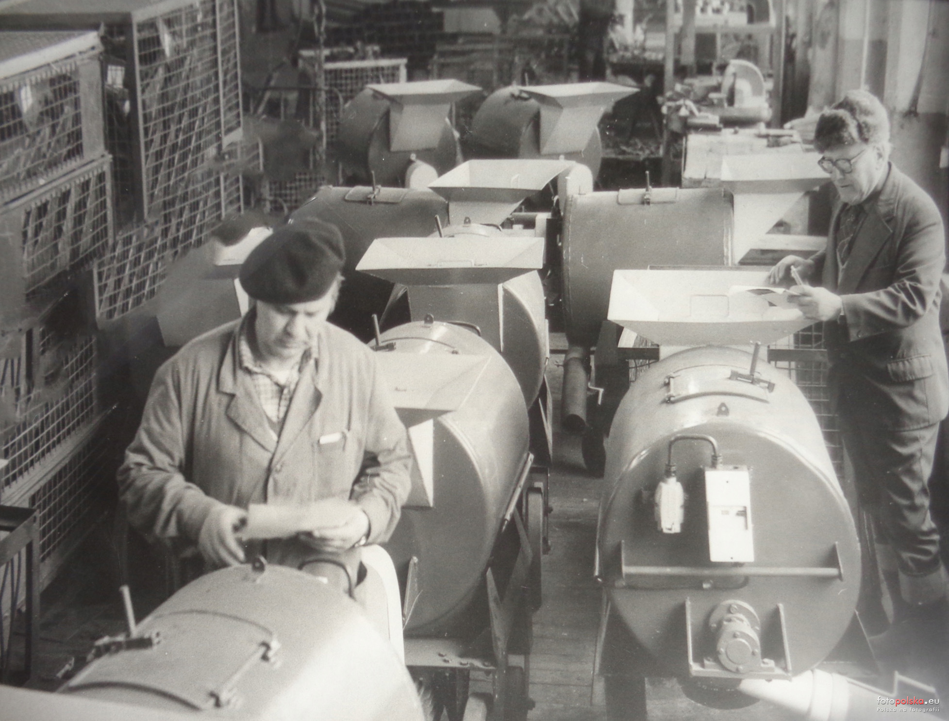 26 lutego 1987 , POM Gronowo Elbląskie, który podjął się produkcji opracowanego przez gdański "Meprozet" przejezdnego rozdrabniacza mieszalnika do pasz gospodarskich, może rocznie wypuścić minimum 1000 sztuk takich urządzeń, oczywiście jeśli zapewniony będzie niezbędny do tego materiał. Rozdrabniacz mieszalnik z Gronowa, zmontowano już serię informacyjną 10 sztuk, przeznaczony jest dla indywidualnych hodowców trzody chlewnej. Przy jego pomocy można szybko i bez wysiłku przygotować około 200 l rozdrobnionej i wymieszanej paszy , rozwieść do koryt. Rozdrabniać można przy tym zarówno buraki, brukiew, zielonki, jak i ziemniaki parowane, kiszone czy pasze treściwe. Zanim zaś napłyną zamówienia, POM w Gronowie wytwarza części zamienne dla łódzkiej "Agromy" oraz grudziądzkiej "Unii". Na zdjęciu: odbiór techniczny przejezdnych rozdrabniaczy mieszalników do pasz gospodarskich serii informacyjnej, po lewej kontroler jakości Zbigniew Baboń po prawej Adam Kisielewski.Skomentuj zdjęcie |