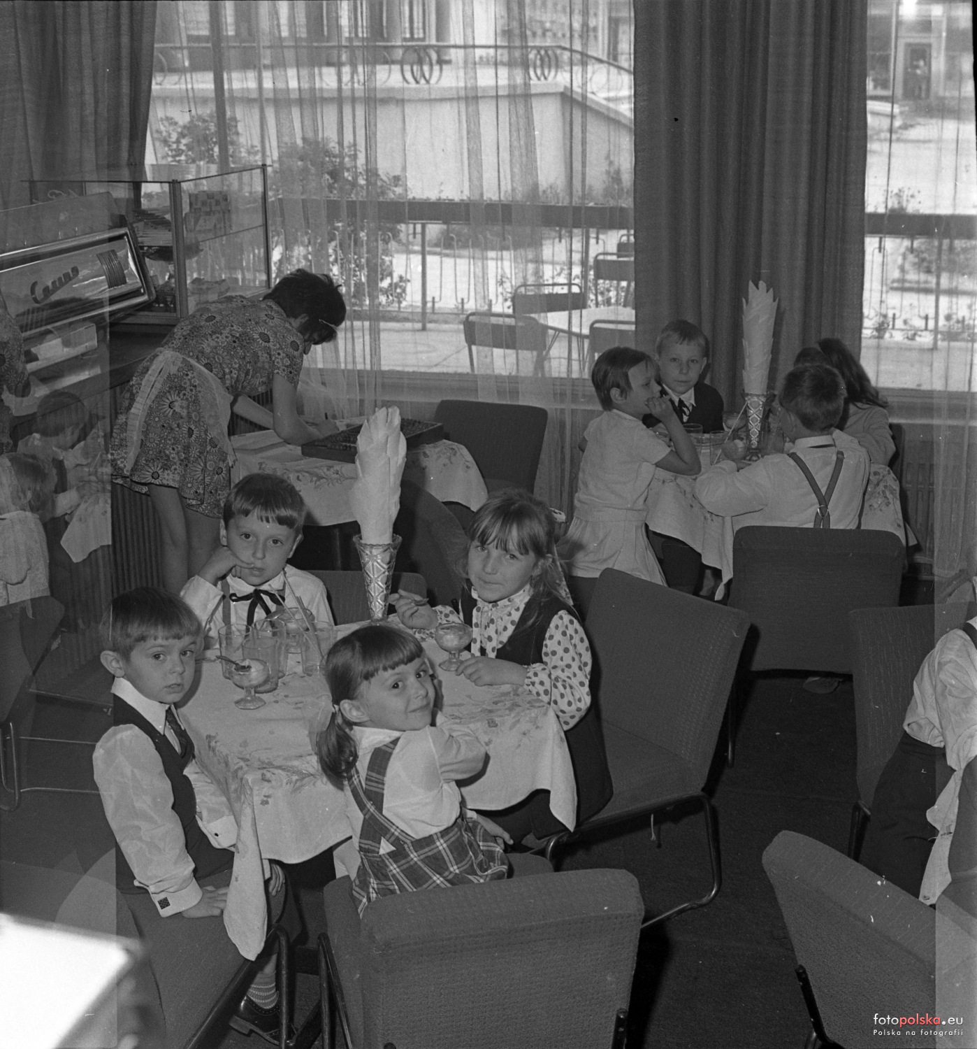 1971 , Giżyckie przedszkolaki na lodach w kawiarni "Ekran". Za oknem schody do kina "Fala"Skomentuj zdjęcie
