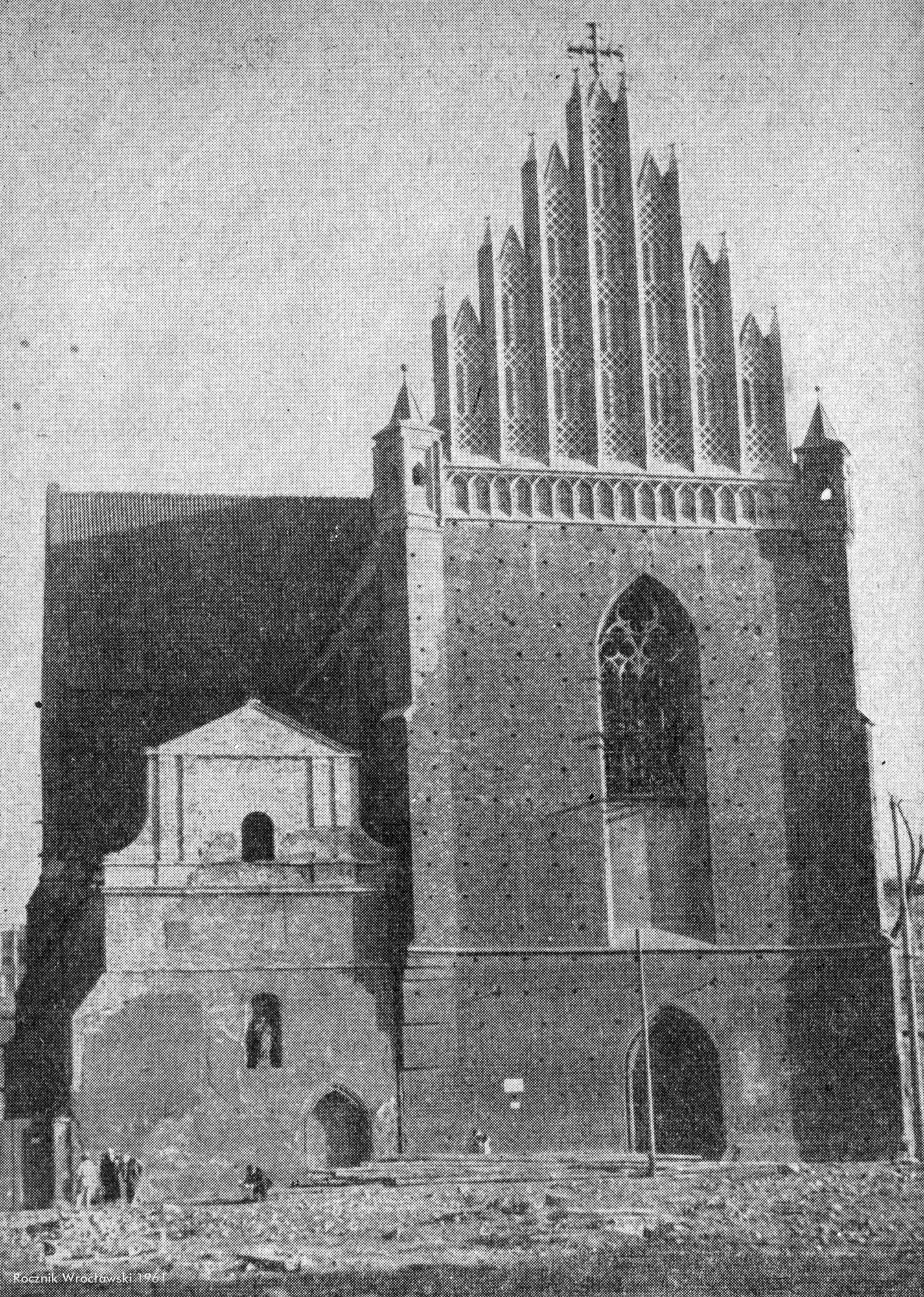 Kościół św. Wojciecha więcej zdjęć (233) Atrakcja turystyczna Zbudowano: XIII w. Dawniej: Adalbertkirche Zabytek: 15 z 28.11.1947; D/1 z 17.02.1960 oraz 165 z 15.02.1962 Pierwszy kościół parafialny pod wezwaniem św. Wojciecha wzniesiony został na początku XII w. i poświęcony przez biskupa wrocławskiego Żyrosława. Wkrótce świątynia przekazana została kanonikom regularnym laterańskim św. Augustyna z Wyspy Piaskowej. W 1226 r. biskup Wawrzyniec osadził przy kościele dominikanów przybyłych z Krakowa, którym przewodził Czesław według tradycji należący do rodu Odrowążów, pierwszy przeor klasztoru wrocławskiego. Konwent został poważnie uszkodzony w 1241 r. podczas najazdu mongolskiego, dlatego w latach 1250 – 1270 wzniesiono nowy korpus nawowy z transeptem, a do końca XIII w. rozebrano dotychczasowy chór, który zastąpiono nowym gotyckim, poświęconym w 1330 r. przez biskupa Nankiera. W 2 połowie XIV w. podwyższono mury nawy głównej i transeptu, a sto lat później dodano wąskie przęsło zachodnie i fasadę z ozdobnym ceramicznym szczytem. W 1359 wzniesiono wieżę, którą pod koniec XV w. zwieńczono wysokim ostrosłupowym hełmem. W tym okresie wybudowano również po północnej stronie kościoła kaplicę św. Wita, obecnie św. Józefa. Na początku XVI w. konwent wrocławski przeżywał prawdziwy rozkwit, przebywało w nim około 90 zakonników, a działająca przy klasztorze szkoła teologiczna dla braci, otrzymała w 1520 roku prawa szkoły wyższej, Studium Generale. Dominikanie posiadali także bogatą bibliotekę, która po likwidacji klasztoru trafiła do zbiorów Biblioteki Uniwersyteckiej. Kilka lat później błyskawiczny rozwój reformacji we Wrocławiu przyniósł kryzys życia zakonnego, podobnie jak w innych śląskich placówkach, ale nie spowodował wyludnienia klasztoru, ani jego likwidacji. W 1524 r. kilku zakonników wzięło udział w słynnej dyspucie teologicznej z protestantami, która odbyła się w kościele św. Stanisława, św. Wacława i św. Doroty, i uznana została za zwycięstwo luteranizmu w naszym mieście. Na początku XVII w. przybył do Wrocławia z Krakowa o. Abraham Bzowski wraz z 20 zakonnikami. Za jego kadencji miał miejsce najbardziej dramatyczny epizod wrocławskiej reformacji, kiedy to 27 grudnia 1608 roku tłum protestantów zdewastował i sprofanował dominikańską świątynię. Powodem tego, jak się przypuszcza, była kontrreformacyjna działalność polskiego przeora, który w ten sposób został zmuszony do opuszczenia miasta, jak również rzekome przybycie do klasztoru kilku jezuitów. Klasztor wrocławski pozostał w prowincji polskiej do 1706 r., kiedy to wraz z innymi śląskimi placówkami został włączony do prowincji czeskiej, gdzie pełnił najważniejszą rolę po klasztorze praskim. Znalazło to swój wyraz w odrodzeniu konwentu i w licznych fundacjach artystycznych. W 1650 r. po południowej stronie kościoła, pomiędzy transeptem, a nawą, w miejscu gotyckiej kaplicy NMP, wzniesiono wczesnobarokową kaplicę św. Krzyża (Moncady), a w 1679 r., hrabia Jan Franciszek z Wierzbnej ufundował w zachodniej części prezbiterium Kaplicę Loretańską (proj. Carlo Rossi), rozebraną w 1850 r. Po zajęciu Śląska przez Prusy, w 1754 r. utworzono samodzielną Kongregację Błogosławionego Czesława, która istniała do kasaty klasztorów śląskich w 1810 roku. Po sekularyzacji kościół stał się diecezjalną świątynią parafialną. W 1945 r. został zniszczony w około 75%, a jego odbudowa ruszyła na początku lat pięćdziesiątych, kiedy to znowu objęli go dominikanie z Krakowa. 9 listopada 1958 r. dokonano uroczystego poświęcenia kościoła, a w 1959 r. przywieziono cudowny obraz Matki Bożej z Podkamienia. Odbudowę zakończono w 1981 r., wieńcząc wieżę wysokim ostrosłupowym hełmem. Kościół Św. Wojciecha jest świątynią jednonawową, wzniesioną z cegły, na planie krzyża łacińskiego, z długim wyodrębnionym prezbiterium, zamkniętym wielobocznie i skierowanym na wschód. W reprezentacyjnej fasadzie zachodniej znajduje się ostrołukowy portal, bogato profilowany szczyt ceramiczny i okazały krzyż zdwojony. Wnętrze o długości 72m i wysokości 22m, przykrywają sklepienia krzyżowo – żebrowe i gwiaździste. Po obu stronach prezbiterium znajdują się, kaplica akademicka (po stronie południowej) i zakrystia (po stronie północnej). Na południowej elewacji nawy i obu ramion transeptu biegnie dekoracyjny fryz, składający się z motywu przenikających się arkad i lilii, który wyznacza ich pierwotną wysokość, przed podwyższeniem w końcu XIV w. Kościół posiada skromny wystrój i wyposażenie na które składają się m.in. witraże w trzech oknach chóru z przedstawieniami św. Jacka, św. Wojciecha i bł. Czesława (1970, proj. Krystyna i Stanisław Pękalscy) witraże w transepcie (1981-82, proj. Teresa Reklewska) m.in. Chrystusa w chwale i Czterech Jeźdźców Apokalipsy, Niewiasta obleczona w księżyc i aniołowie oraz w oknie zachodnim o motywach abstrakcyjnych (proj. Tadeusz Wojciechowski). W rokokowym ołtarzu bocznym umieszczony jest obraz Matki Bożej Różańcowej z Podkamienia (Lwów, 1612), koronowany w 1727, a na ścianach nawy i prezbiterium stacje Drogi Krzyżowej (Jeremias Josef Knechtel z Legnicy, 1750). Ołtarz główny zdobi naturalnej wielkości figura Chrystusa Ukrzyżowanego (Christian Behrens, 1896), pochodząca z dawnego ołtarza głównego kościoła św. Marii Magdaleny. Pomimo skromnego wystroju i wyposażenia, kościół zachwyca jasnym wnętrzem o szlachetnych proporcjach, w którym dominują biel ścian, skontrastowana z ceglanymi żebrami sklepień i barwnymi witrażami. za : pl. Dominikański więcej zdjęć (812) Dawniej: Dominikaner Platz Plac Dominikański we Wrocławiu (niem. Dominikanerplatz) - jeden z głównych placów Wrocławia. Pierwotny plac Dominikański przylegał do południowej elewacj