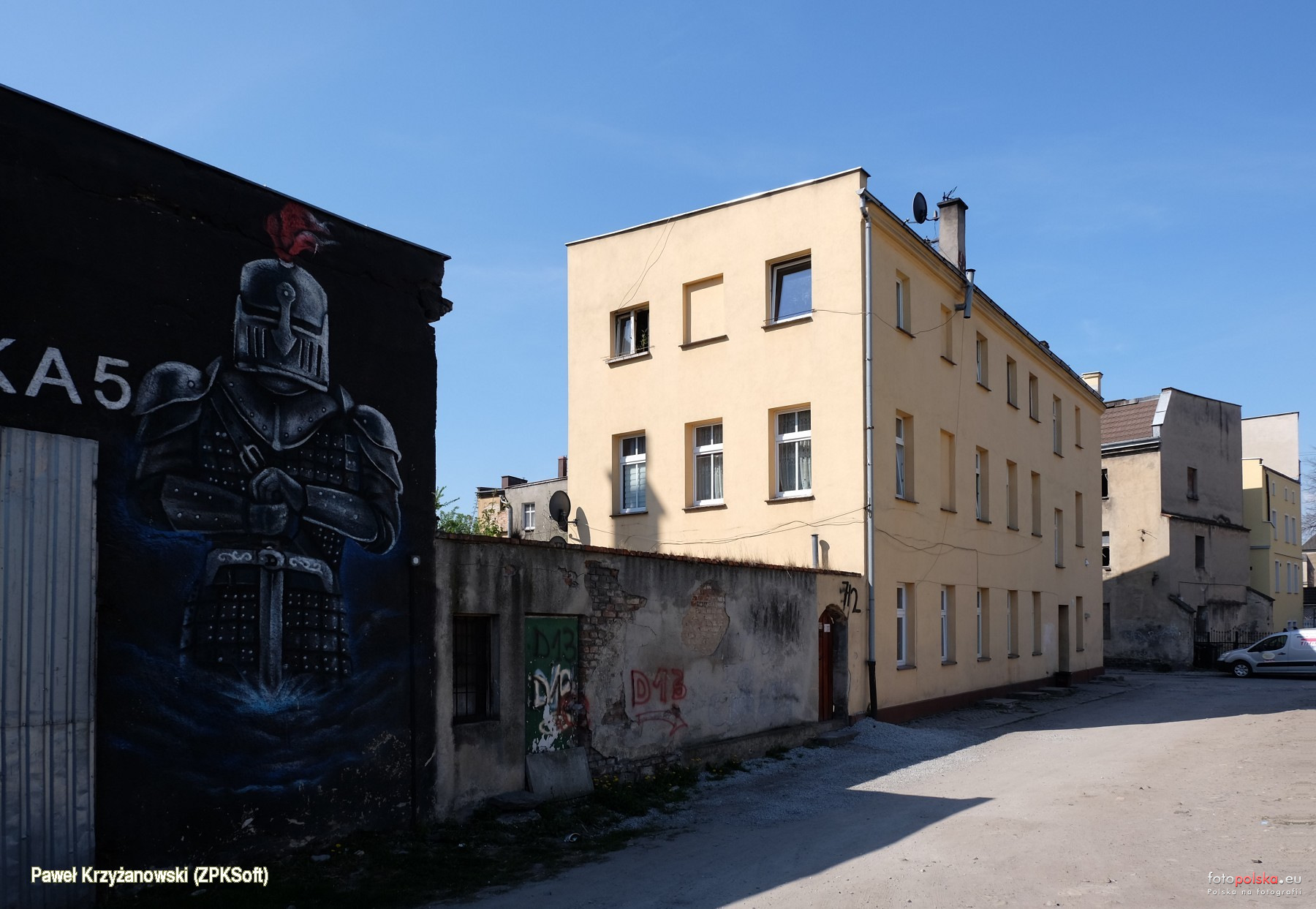 28 kwietnia 2020 , W budyniowym kolorze wielorodzinny dom mieszkalny przy Rycerskiej 7, wzniesiony w k. XIX w. I jak na ulicę Rycerską przystało jest tu i rycerz wymalowany na barakowym budynku z nr 5.Skomentuj zdjęcie |