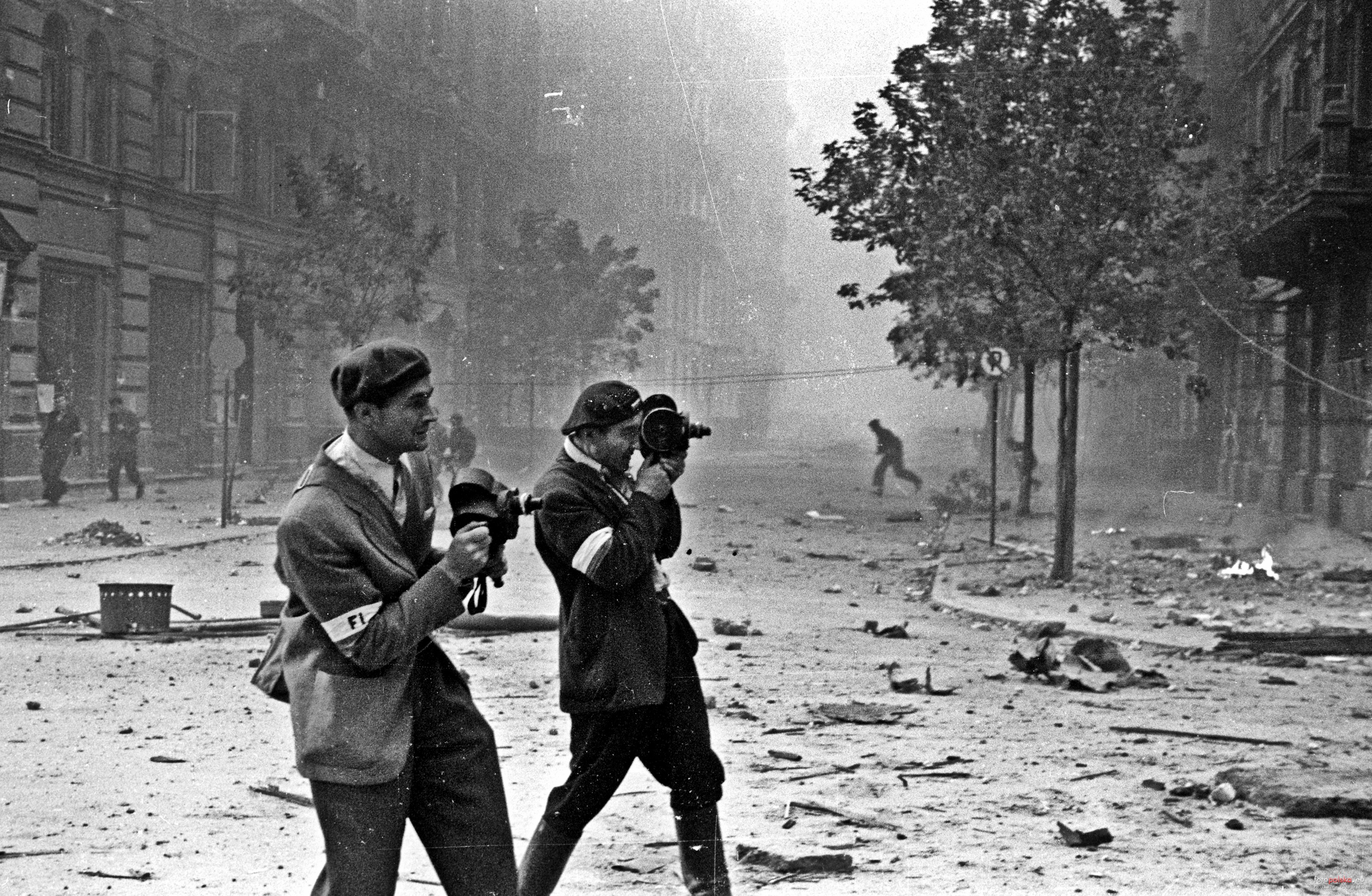 sierpień 1944 , Operatorzy filmowi z Biura Informacji i Propagandy Komendy Głównej Armii Krajowej - Stefan Bagiński i Antoni Wawrzyniak, podczas dokumentowania pożarów kamienic przy ulicach Jasnej i Moniuszki. Ujęcie ul. Moniuszki od ul. Jasnej w kierunku Marszałkowskiej. Po lewej widoczny fragment Filharmonii, w oddali gmach Towarzystwa Ubezpieczeń "Rosja"Skomentuj zdjęcie