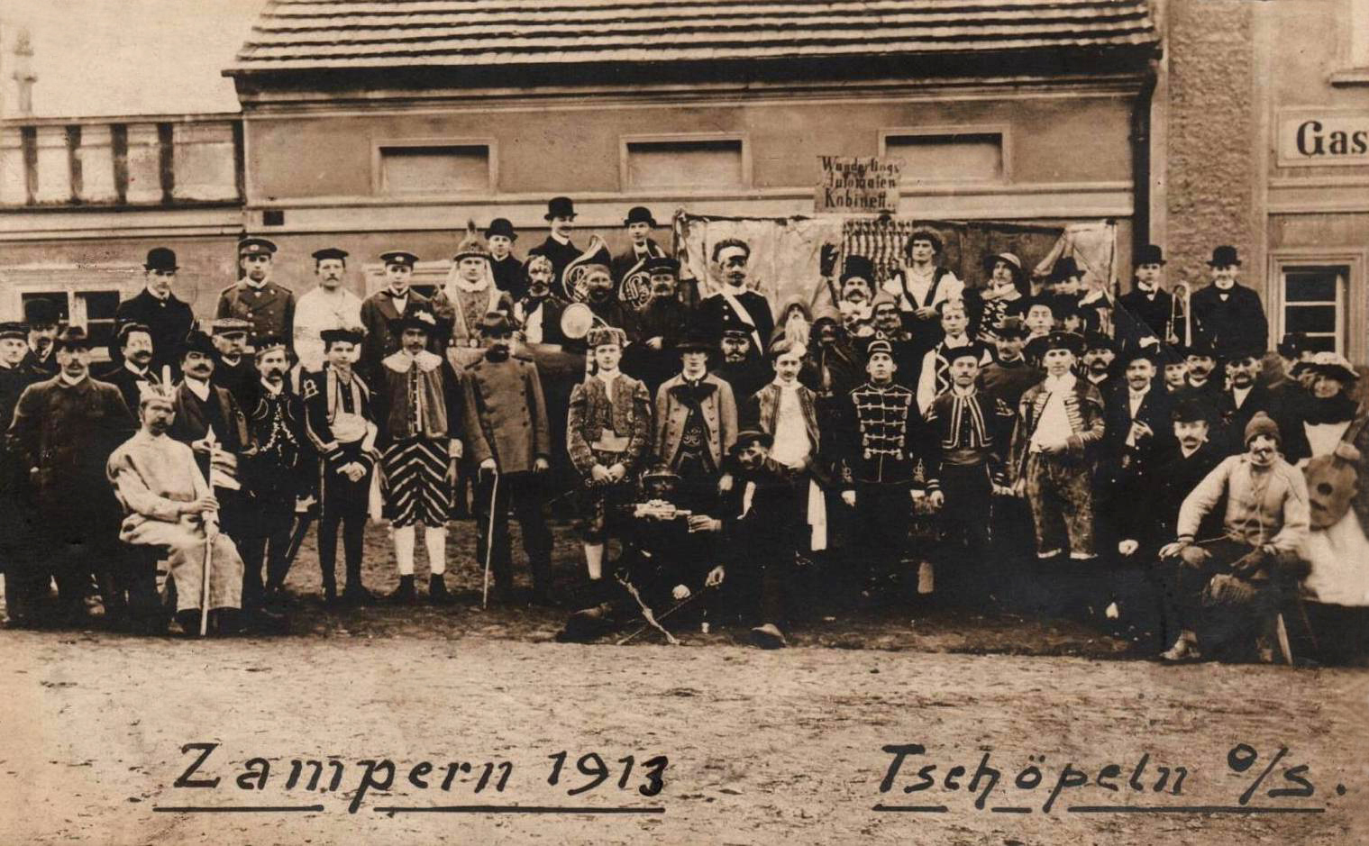 4 lutego 1913 , Ostatki w Czaplach - stara tradycja serbska w przededniu środy popielcowej (gałązkami wikliny i brzozy, muzyką i hałasem przebierańcy przeganiają złe duchy, demony jak również zimę). W tle gospoda "Gasthof zum Jägerhaus" widoczna w całości na widokówce: . Przy nazwie miejscowości zamiast "O.S" powinno być "O.L." (Oberlausitz).Skomentuj zdjęcie |
