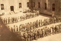 1916 , Legioniści w Piotrkowie Trybunalskim. Kolejka do jakiejś komisji.Skomentuj zdjęcie