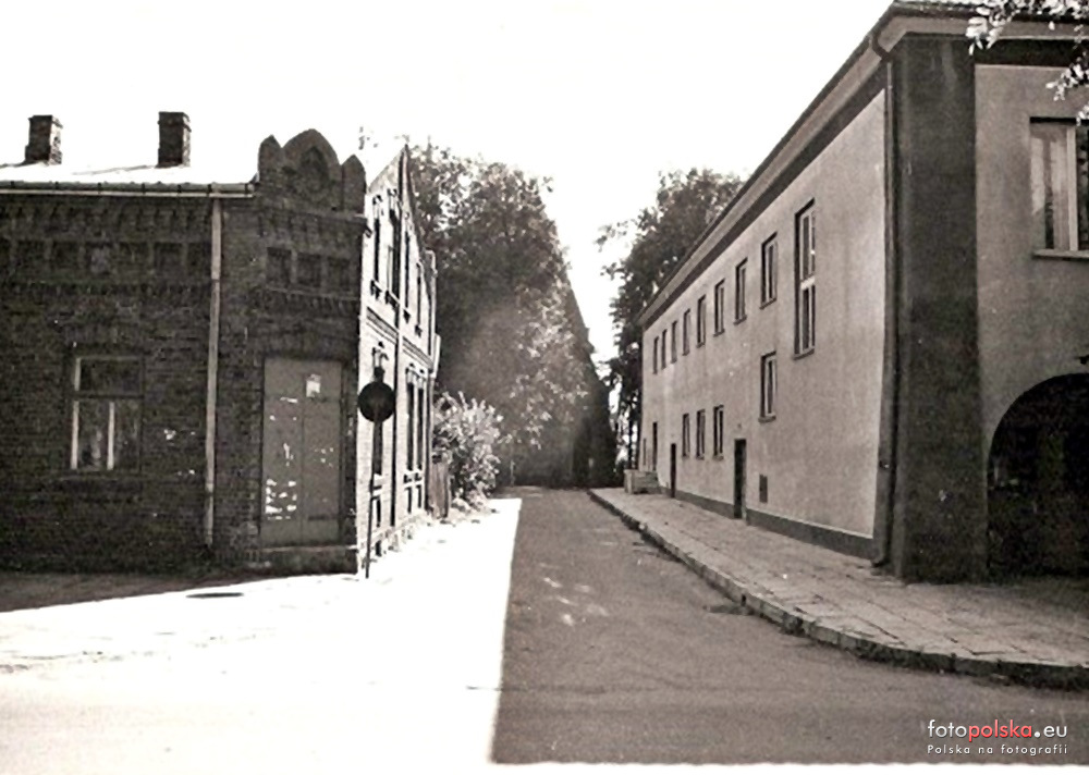 Lata 1960-1970 , Po lewej fragment budynku przy ul. Rynek 8, na rogu Kościelnej, W tle Kościół Narodzenia Najświętszej Maryi Panny i św. Jakuba Starszego, po prawej (Rynek 9) fragment obecnego budynku Gminnego Domu Kultury. |