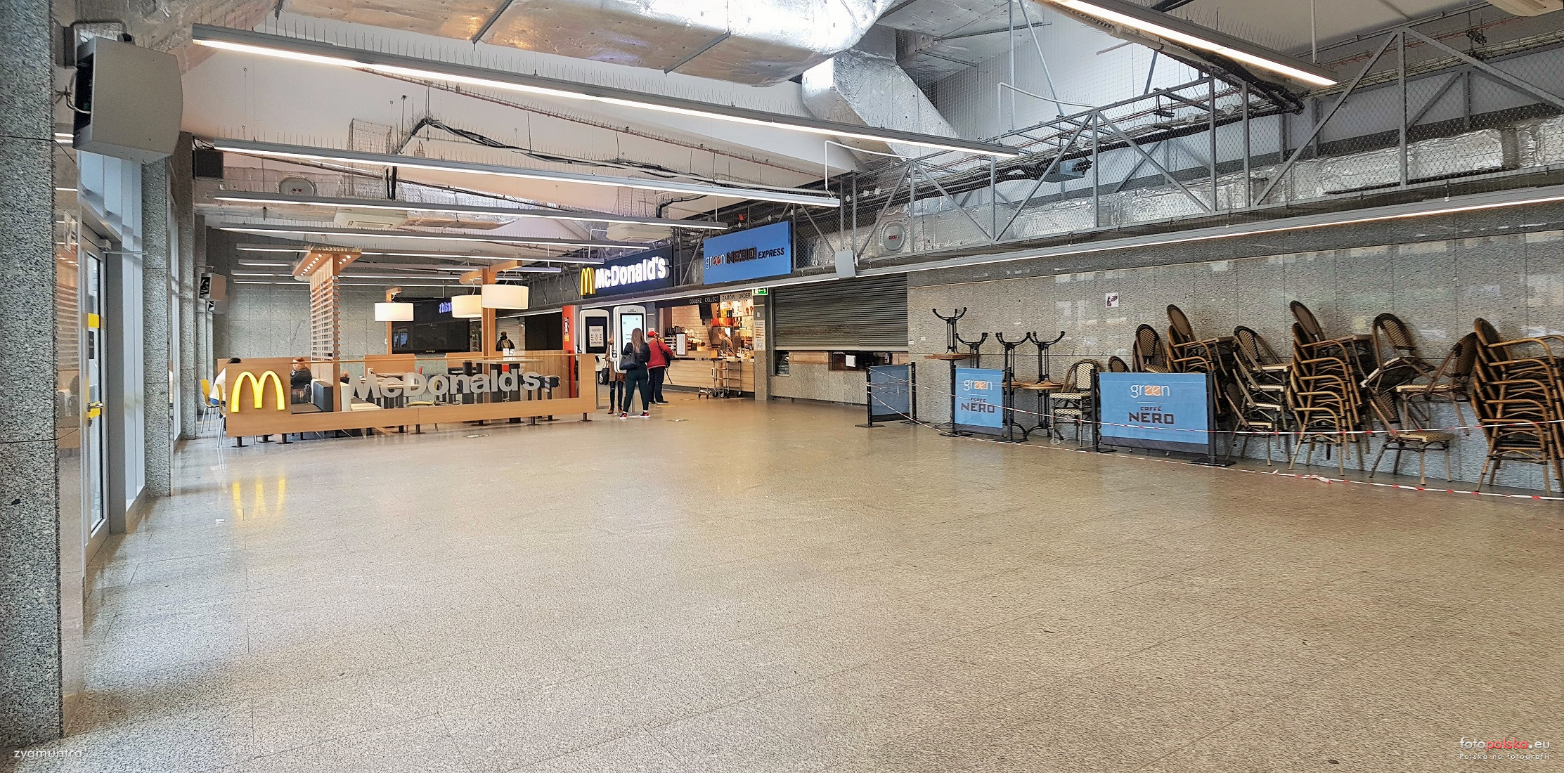 20 maja 2020 , Warszawa Wschodnia - fragment wnętrza hali głównej dworca w części gastronomicznej, ograniczonej w działalności z uwagi na COVID-19.Skomentuj zdjęcie
