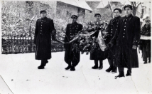 Lata 1960-1965 , Jeleniogórscy tramwajarze w kondukcie pogrzebowym. Zdjęcie pochodzi ze zbiorów Pani Sabiny Ewy Bielawskiej-Budnik - za udostępnienie bardzo dziękuję. Serdecznie dziękuję również kol. Antypuszka, który spotkał się z Panią Sabiną oraz zeskanował wszystkie zdjęcia.