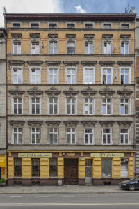 0 pobrań 392 odsłony 6 średnia ocen Poprzednie i następne zdjęcia Vojtech Csernók Obiekty widoczne na zdjęciu ul. Trzebnicka więcej zdjęć (566) Dawniej: Trebnitzer Strasse Ulica Trzebnicka we Wrocławiu – jedna z arterii wylotowych, prowadzących od Starego Miasta na północ, w kierunku Trzebnicy. Zaczyna się na placu św. Macieja, a kończy na mostach Trzebnickich przez Starą Odrę. Przebiega przez osiedle Kleczków (część dawnego Przedmieścia Odrzańskiego). Przedłużeniem ulicy Trzebnickiej za mostami Trzebnickimi jest ul. Żmigrodzka, przecinająca Karłowice i Poświętne. Długość ulicy wynosi 1,1 km; w połowie długości, przy pl. Powstańców Wielkopolskich, przecina ją wiadukt kolejowy. Południowy odcinek jezdni ulicy Trzebnickiej (do pl. Powstańców Wielkopolskich) jest stosunkowo wąski (po jednym pasie ruchu w obu kierunkach, bez tramwaju); odcinek północny jest szerszy i mieści także tory tramwajowe. W przeszłości część dzisiejszej ulicy Trzebnickiej (od pl. Powstańców Wielkopolskich do mostów Trzebnickich) stanowiła fragment Szosy Trzebnickiej (niem. Trebnitzer Chausee). Dawna rogatka miejska (Trebnitzer Barriere) zlokalizowana była w pobliżu skrzyżowania z ul. Ołbińską. Po roku 1868, w związku z budową linii kolejowej Prawego Brzegu Odry i korekcie sieci ulicznej (związanej także z wytyczonym w 1873 na dawnym Polu Maciejowym – Mathiasfeld – placem św. Macieja) przebieg nowo utworzonej Trebnitzerstraße przybrał współczesny kształt ulicy Trzebnickiej. Wybudowane wzdłuż ulicy budynki w większości powstały przed rokiem 1910 i podczas oblężenia Festung Breslau w 1945 prawie wszystkie przetrwały w stopniu, pozwalającym ich odbudowę; jest to jedna z nielicznych ulic miasta, których stuletnia zabudowa zachowała się w tak dużym stopniu do XXI wieku. Prócz kamienic mieszkalnych – w większości 5- i 6-kondygnacyjnych, często ze zlokalizowanymi na parterze lub w suterenie sklepami i małymi zakładami usługowymi – wzdłuż ulicy Trzebnickiej wybudowano m.in. w latach 1894-1895 gmach przytułku Fundacji Claasseena (wg projektu Richarda Plüddemanna, pod numerem 25-27, pomiędzy ul. św. Wincentego a Ołbińską, dziś szpital MSW), szkołę (1905-1908, projekt R. Plüddemanna i Ch. Cabanisa, pod numerem 42-44, przy skrzyżowaniu z ul. Dębickiego i z ul. Kleczkowską, dziś Kolegium Nauczycielskie), a także gazownię miejską (nr 35, projekt i budowa – rok 1881 i następne, dziś Zakład Energetyczny) i jej budynek administracyjny (nr 33, rok 1938, dziś urząd skarbowy dzielnicy Psie Pole). Źródło: Autorzy: Licencja: CC-BY-SA 3.0 Trzebnicka 13 więcej zdjęć (6) |