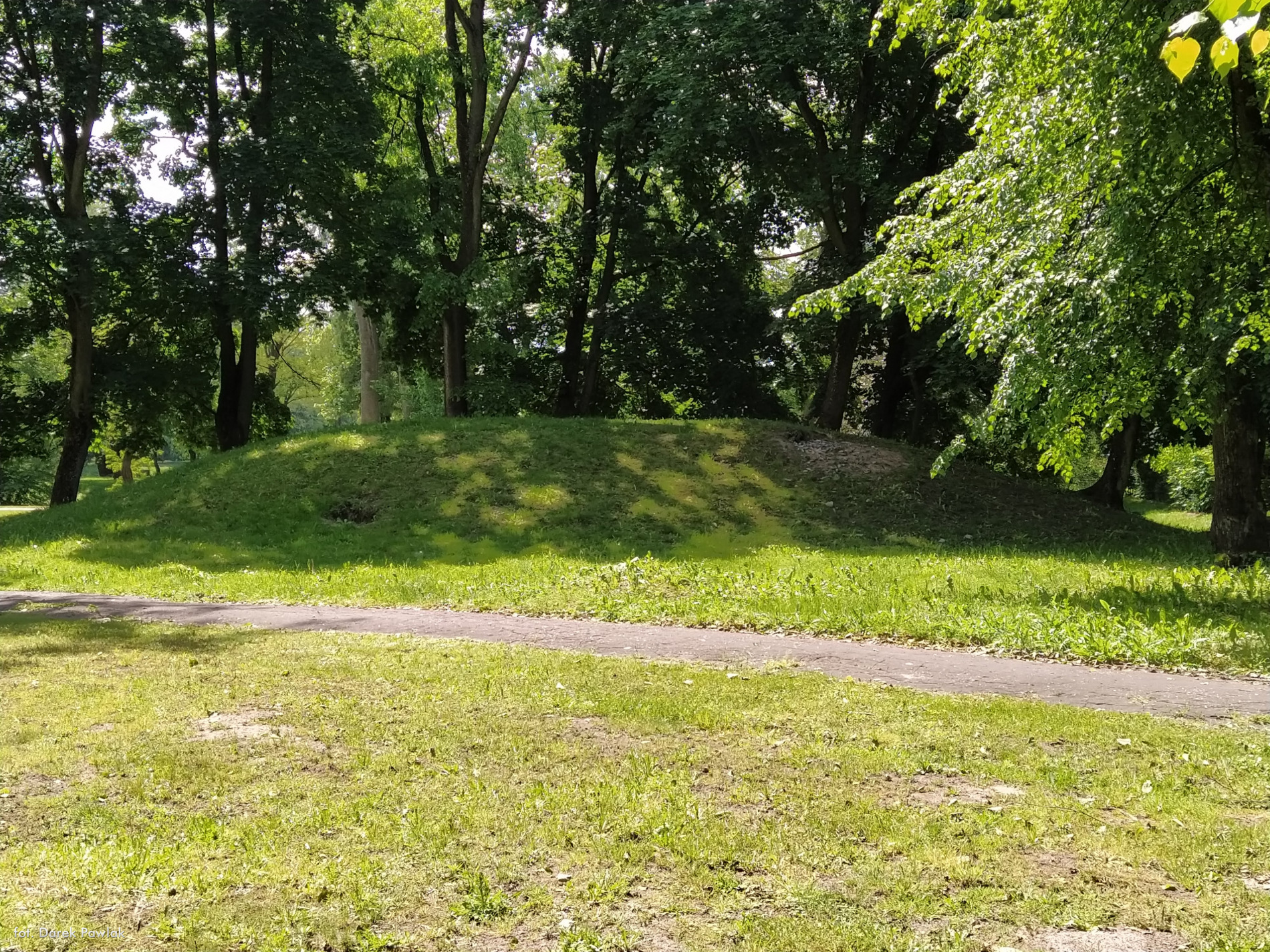 4 czerwca 2020 , Widok od strony pałacu. Widać alejkę prowadzącą na wyspę. Na pozór zwykły parkowy pagórek, to jednak ziemianka. W przeszłości służyła do składowania lodu na potrzeby pałacu.Skomentuj zdjęcie