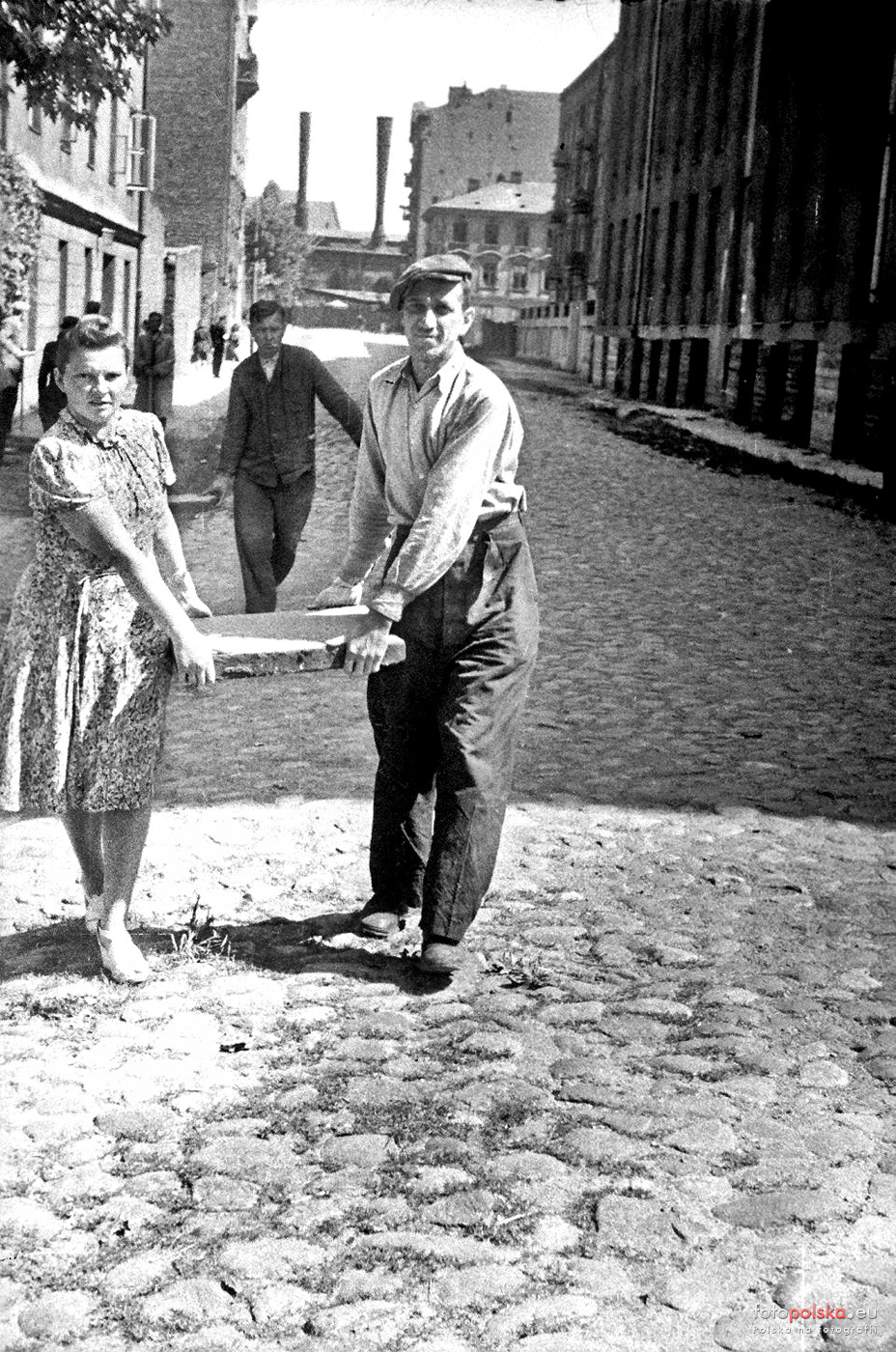 20 sierpnia 1944 , Mieszkańcy niosą płyty chodnikowe, z których budowana jest barykada. Kobieta widoczna na fotografii to Halina Bukowska, żona autora zdjęcia. Perspektywę ulicy zamykają kominy Elektrowni Miejskiej. Ze zbiorów MPW.Skomentuj zdjęcie |