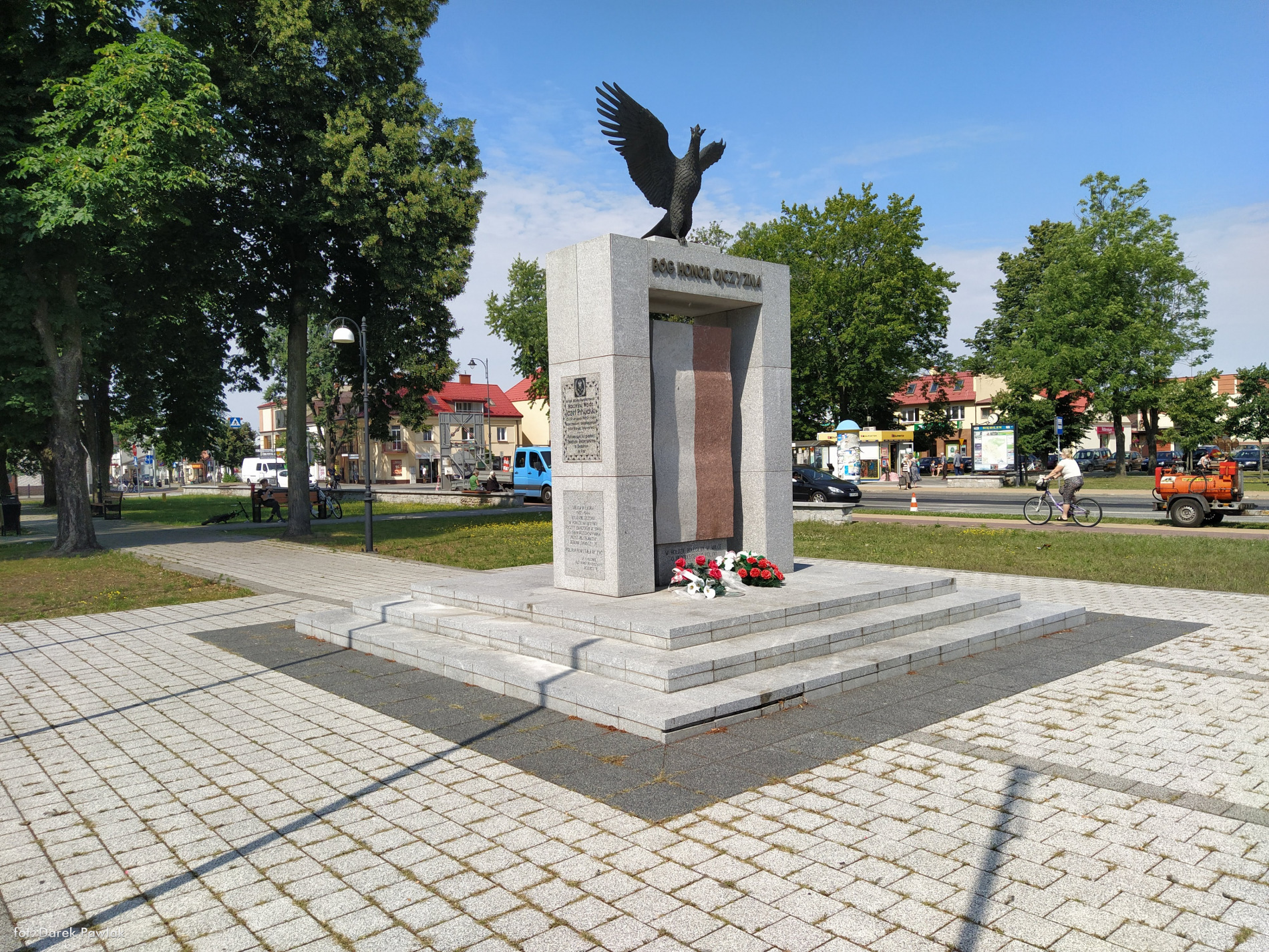 Pomnik niepodległości więcej zdjęć (4) Architekci: Teresa Ziober – Zomer (rzeźbiarz), Tadeusz Zomer (rzeźbiarz) Wykonawca: Zakład Usług Administracyjno Budowlanych Karol Liberski, Zwoleń Zbudowano: 2013 Kiedy przystępowano do rewitalizacji Rynku w 2013 roku planowano ją zakończyć postawieniem Pomnika Niepodległości, pamiętano bowiem że kiedyś przed urzędem gminy stał obelisk z tablicami upamiętniającymi wymarsz oddziałów rozpoczynający manewr znad Wieprza w ramach bitwy Warszawskiej 1920 roku. Robiąc wykopy pod planowaną fontannę zaskoczeni robotnicy odnaleźli szczątki tego obelisku. Sporządzone repliki tablic z nazwiskami poległych obywateli gminy Irena zostały wmontowane w północną ściankę pomnika. Na ścianę południową trafiły z kolei dwie inne tablice. Górna, ufundowana w 1937 Przez Związek Rezerwistów, była pierwotnie umieszczona na budynku dawnej poczty. Po zniszczeniu i rozebraniu budynku była przechowywana w rękach prywatnych aż do 1989 roku. Potem wraz z dolną tablicą opisującą historię tej przedwojennej była eksponowana na płycie u zbiegu ulic Piłsudskiego i Niepodległości w obrębie Rynku, aby ostatecznie po zakończeniu rewitalizacji Rynku, trafić na obecny pomnik. Rynek więcej zdjęć (90) |