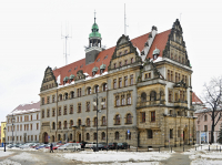 Nowy Ratusz więcej zdjęć (74) Zbudowano: 1902-1905 Dawniej: Neues Rathaus Zabytek: 589/543/L Nowy Ratusz wzniesiony w latach 1902-1905 jest efektem realizacji pierwszej części projektu, zakładającego docelowo powstanie czteroskrzydłowego zespołu z dwoma dziedzińcami wewnętrznymi oraz monumentalną wieżą. Budowa, zapewne z braku funduszy, nigdy nie została zakończona. Pod koniec XIX w. barokowy ratusz usytuowany w Rynku, przestał odpowiadać potrzebom i aspiracjom władz Legnicy. Miasto, zarządzane w lalach 1872-1912 przez nadburmistrza Ottomara Oertla, rozwijało się dynamicznie, zwiększając terytorium, ilość mieszkańców, a także podejmując realizację szeregu ważnych inwestycji komunalnych. Spowodowało to m.in. trzykrotny, w okresie od 1872 do 1904 r. wzrost liczby urzędników zatrudnianych w miejskiej administracji. Zarówno władze miasta jak i jego mieszkańcy uważali, iż ratusz, symbol samorządu powinien znajdować się w Rynku. Realizacja tego postulatu okazała się, z uwagi na charakter zabudowy placu niemożliwa. W końcu zdecydowano o lokalizacji nowej siedziby urzędu miejskiego w pobliżu Rynku, na obszarze położonym na południe od kościoła Piotra i Pawła, przyległym do dzisiejszego pl. Słowiańskiego. Miejsce stwarzało jednak pewne problemy, teren był zabudowany, a jego część należało wykupić od właścicieli. W 1901 r. opracowanie projektu Nowego Ratusza zlecono radcy budowlanemu Lotharowi Schonfelderowi, a gdy opuścił on Legnicą, zadanie wraz ze stanowiskiem powierzono jego następcy. Był nim, przybyły do Legnicy w październiku 1901 r., Paul Oehlmann. W kwietniu 1902 r., na posiedzeniu rady miasta. Oehlmann przedstawił swoje projekty. Przyjęto wówczas założenia generalne m.in. rzuty poziome gmachu, pomysł budowy w dwóch etapach, jednak w zakresie formy zasugerowano wprowadzenie, w miejsce gotyku, elementów renesansowych i barokowych. W lipcu zatwierdzono zarówno nowe rozwiązania stylistyczne uwzględniające uwagi komisji budowlanej jak i kosztorys. Równolegle prowadzono prace nad przygotowaniem terenu pod budowę. Wiosną rozebrano dawne domy parafialne i mieszkalne, w czerwcu przy użyciu dynamitu wysadzono mury obronne wraz z zabytkową bramą miejską. 30 sierpnia 1902 r. rozpoczęto prace budowlane. Spore trudności napotkano podczas kładzenia fundamentów, ponieważ część budowli miała być posadowiona na terenie dawnej fosy i wałów fortyfikacyjnych, a na głębokości 2,5 m wystąpiła woda gruntowa. Jesienią 1903 r. budynek ratusza był gotowy w stanie surowym, zaś jego uroczyste poświecenie nastąpiło 8 kwietnia 1905 r. Oddane wówczas do użytku, istniejące do dzisiaj dwa skrzydła miały pełnić, do czasu realizacji drugiego etapu projektu, funkcje całego założenia. Znaczną część parteru przeznaczono na potrzeby podległej samorządowi policji. Znalazły się tutaj pomieszczenia, biurowe i policyjny areszt, ponadto: centrala telefoniczna, lokal straży pożarnej, pokój radnych, a w południowej części skrzydła mieszkanie służbowe. Pierwsze piętro zajął wydział finansowy z kasami i skarbcami oraz biura urzędu podatkowego. Na drugim piętrze, ulokowano gabinet nadburmistrza, salę posiedzeń magistratu z przyległą podręczną biblioteką oraz salę posiedzeń rady miejskiej, która zajęła dwie kondygnacje południowej części skrzydła wschodniego. Większą część trzeciego piętra zajął wydział budowlany. Pozostałe pomieszczenia przeznaczono na pokoje: radnych, radcy szkolnego oraz opieki społecznej. Na poddaszu ulokowano miejskie archiwum. W dawnej siedzibie, w Rynku, pozostawiono m.in. urząd meldunkowy i urząd stanu cywilnego. Budynek Nowego Ratusza zaopatrzono w dwa niezależne od siebie systemy centralnego ogrzewania, na gorącą wodę oraz na niskoprężną parę. W większości pomieszczeni zastosowano oświetlenie gazowe, jedynie sale posiedzeń, gabinet nadburmistrza, pokoje kierowników wydziałów oraz hol głównego wejścia otrzymały dodatkowo oświetlenie eklektyczne. Czterokondygnacyjna budowla, przykryta dwuspadowym dachem, została zaprojektowana w stylu neorenesansowym Z elementami barokowymi. Elewacje od strony pl. Słowiańskiego, ul. św. Piotra i ul. Witelona posiadają bogatą dekorację architektoniczno-rzeźbiarską. Dolna kondygnacja ozdobiona została piaskowcową okładziną, z pasem granitu w przyziemiu. Rustykalne, boniowanie parteru zestawiono z tynkiem o chropowatej fakturze, użytym na ścianach wyższych pięter. Piaskowiec pojawia się ponadto na wykuszach i szczytach budowli oraz w obramieniach okien. Elewacje wewnętrzne widoczne od strony pl. Słowiańskiego, wykonane z surowej cegły i tynku, są znacznie skromniejsze. W początkach XX w., główne wejście do ratusza znajdowało się w skrzydle północnym. Usytuowany na osi fasady piaskowcowy portal posiada w łuku nad wejściem dekorację w postaci korony miejskiej (corona muralis). Nieco wyżej, znajdują się rzeźby wyobrażające twarze srogich urzędników: w środku policjanta, po bokach rachmistrza i sekretarza. Na flankujących wejście kolumnach miały stanąć figury symbolizujące Przemysł i Rolnictwo, dziedziny którym: "miasto swój rozkwit zawdzięcza". Dwie bramy w lewej części fasady. zapewniały przejście i przejazd, wzdłuż skrzydła wschodniego, do dzisiejszej ul. Witelona. W dekoracji potrójnego okna na drugim piętrze, obecnej sali posiedzeń Zarządu Miasta, znajdują się przedstawienia: matki z dzieckiem, pary nowożeńców, a także starca ze śmiercią, symbolizujące: narodziny, ślub i śmierć. Wymowa płaskorzeźb, podobnie jak wystrój niewielkiego wykusza znajdującego się na II piętrze elewacji od strony pl. Słowiańskiego, nawiązują do przyszłej funkcji tych pomieszczeń przeznaczonych na siedzibę urzędu stanu cywilnego. Detale rzeźbiarskie zdobiące wykusz północny odnoszą się do przeszłości miasta. Na filar