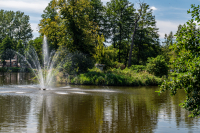 13 sierpnia 2020 , Fragment Stawu Kościelnego z fontanną. Na jednej z wysp na stawie znajduje się kamienny monument, pod którym według legendy jest pochowany ulubiony pies Marysieńki Sobieskiej, która zanim została żoną przyszłego króla, była żoną trzeciego ordynata Jana "Sobiepana" Zamojskiego.Skomentuj zdjęcie |