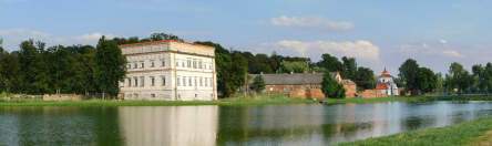 4 sierpnia 2020 , Zespół zamkowo-parkowy - widok od strony zachodniej z przeciwległego brzegu stawu. Po lewej pałac, z prawej brama główna.Skomentuj zdjęcie |