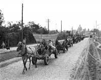 1951 , Chłopi z Wilanowa w trakcie obowiązkowej dostawy zboża. Z Archiwum PAP.Skomentuj zdjęcie