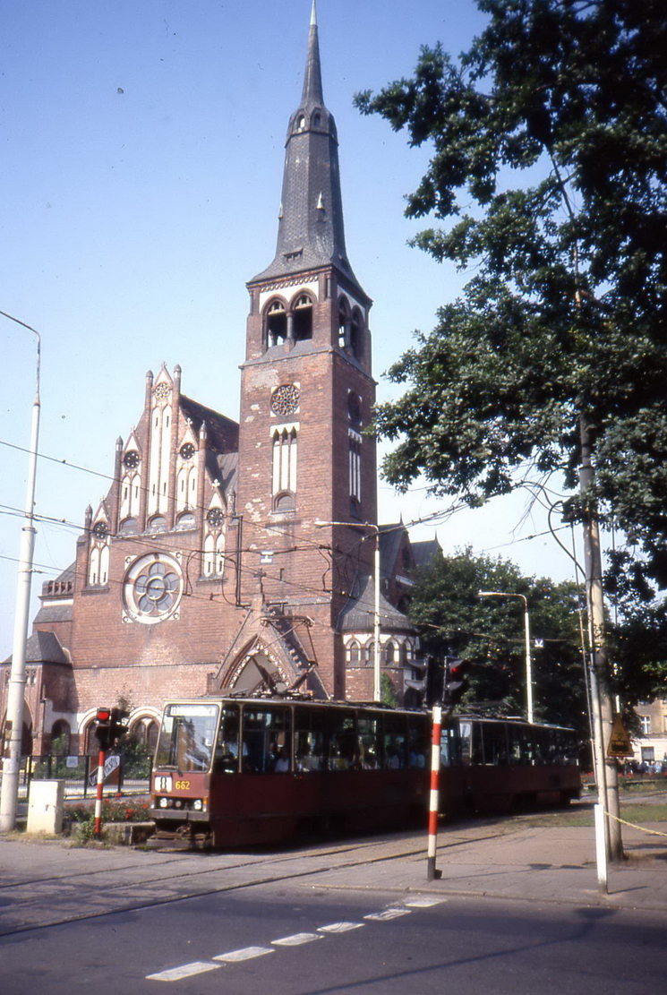 Kościół św. Wojciecha więcej zdjęć (46) Architekt: Jürgen Kröger Atrakcja turystyczna Zbudowano: 1906-1909 Dawniej: Bugenhagen Kirche Zabytek: - Kosciól zbudowany zostal w latach 1906-1909 wg projektu berlinskiego architekta Jurgena Krogera. Nosil wówczas wezwanie Bugenhagena i sluzyl nowo utworzonej (w 1900 r.) parafii protestanckiej. Wnetrze kosciola przewidziano wówczas dla okolo 1500 osób. Budowla miala 35m dlugosci, 23m szerokosci i 17m wysokosci z 65 metrowa wieza. Kosciól usytuowany jest w centrum miasta, na terenie dawnego (XIX w.) cmentarza wojskowego. Typ 105N/105Na (Konstal) więcej zdjęć (200) Zbudowano: 1975 Zlikwidowano: 2020 105N jest czteroosiowym tramwajem napędzanym czterema silnikami o łącznej mocy godzinowej 166 kW. Jego układ elektryczny w prostej linii pochodzi z wagonów rodziny 13N (a przez to z wagonów PCC). Rozrząd następuje samoczynnie z pomocą rozrusznika komutatorowego. Do zasilania obwodu niskiego napięcia służy przetwornica prądu stałego 600/40 V. Hamowanie robocze jest elektrodynamiczne (silniki stają się prądnicami), jako hamulce postojowe działają układy szczękowo-bębnowe, a hamowanie awaryjne realizowanej jest przez hamulec szynowy. Jedną z wad tego tramwaju jest zastosowanie nowych wózków jezdnych nieposiadających piasecznic, co znacznie utrudnia ruszanie oraz podjazd pod wzniesienia w trudnych warunkach atmosferycznych. Ostatnie wagony 105N zostały wycofane w grudniu 2014 roku. Tramwaje w Szczecinie więcej zdjęć (103) Zbudowano: 1879, 1897 Komunikacja miejska w Szczecinie więcej zdjęć (3) pl. Zwycięstwa więcej zdjęć (277) Dawniej: Platz der Republik, Hohenzollernplatz |