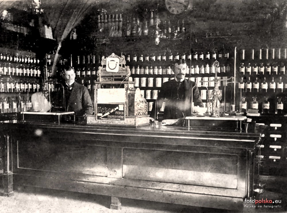 Lata 1910-1917 , APTEKA KAWSKICH. Wnętrze apteki Mariana Kawskiego przy ul. Kościuszki w Sanoku. |