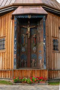 Kościół św. Andrzeja Apostoła więcej zdjęć (11) Zbudowano: 1693-97 Zabytek: - Kościół p.w. Świętego Andrzeja Apostoła z lat 1693 – 97. Zbudowany z fundacji Hieronima Sędzimira. Wieża pochodzi z ok. 1720 r. Remontowany w 1855, 1868 i 1875 r. – nowa zakrystia i dobudowa kaplicy. Kolejny remont w latach 1951 – 53. Odnowienie polichromii w latach 70 XX w. Restaurowany od 2008 r. z odsłonięciem starych polichromii pod kierunkiem mgr Anny Foczek. Budowa i wyposażenie. Kościół drewniany, jednonawowy konstrukcji zrębowej. Orientowany. Prezbiterium mniejsze od nawy, zamknięte trójbocznie z kapliczką z Grupą Ukrzyżowania z przeł. XVIII i XIX w. na zewnątrz i z bocznymi: zakrystią i kaplicą zbudowanymi na planie ośmioboku. Zwieńczone blaszanymi dachami wielobocznymi z kopułkami. Kruchta z boku nawy. Wieża konstrukcji słupowej od frontu z izbicą, o ścianach zwężających się ku górze, poprzedzona przedsionkiem. Dach jednokalenicowy, kryty blachą z ośmioboczną wieżyczką na sygnaturką. Zwieńczona blaszanym hełmem kopulastym z latarnią. Wnętrze podzielone na trzy części przez dwa rzędy słupów. Strop w postaci pozornego sklepienia kolebkowego z płaskimi odcinkami po bokach w nawie. Chór muzyczny wsparty na słupach z wystawką w części środkowej i balustradą tralkową. Prospekt organowy rokokowy z instrumentem z 1905 r., autorstwa Tomasza Falla. Polichromia ornamentalna i figuralna z 1878 r. Przedstawienie na stropie nawy Koronacji NMP przez Trójcę Świętą, prezbiterium Chrystusa. W prezbiterium na ścianach wizerunki Czterech Ewangelistów. Obecnie trwa odsłanianie starej polichromii z XVII w. Ołtarz główny barokowy z k. XVII w. Ołtarz w kaplicy i dwa boczne późnobarokowe z XVIII w. Ambona klasycystyczna z XVIII w. Trzy konfesjonały rokokowe. Chrzcielnica kamienna z 1693 r. w kształcie kielicha. Ogrodzenie z kamienia polnego. kosciolydrewniane.pl |