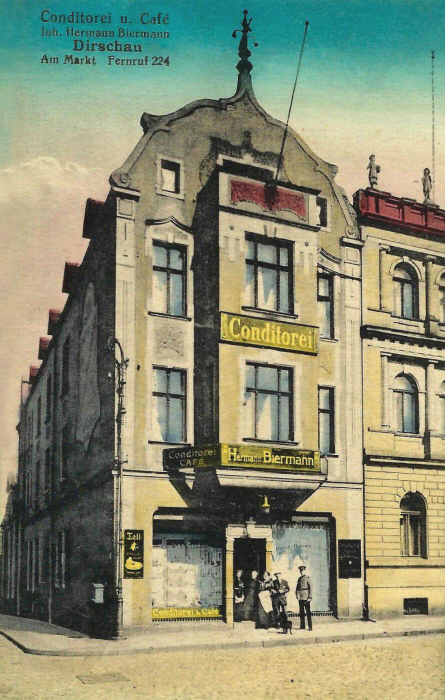 Lata 1905-1910 , Cukiernia i kawiarnia Hermanna Biermanna. Współczesny wygląd kamienicy:Skomentuj zdjęcie