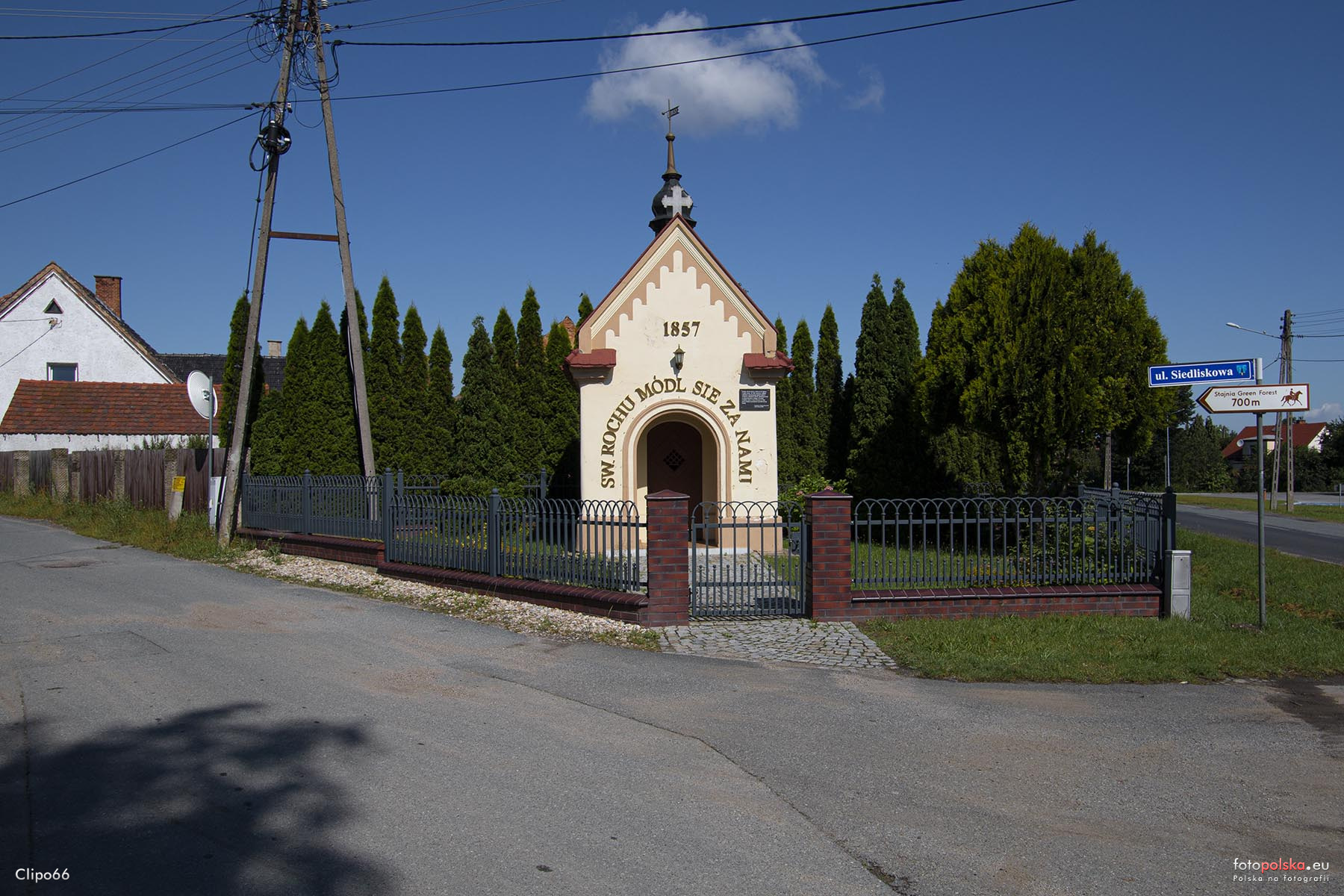 1 pobranie 911 odsłon 6 średnia ocen Poprzednie i następne zdjęcia Clipo66 Obiekty widoczne na zdjęciu Kapliczka św. Rocha więcej zdjęć (6) Zbudowano: 1857 Zbudowali ją miejscowi rolnicy w podzięce za ocalenie ich i mieszkańców Polskiej Nowej Wsi od zarazy cholery, która przedostała się ze wschodu w 1813 roku na ziemię śląską. Kaplica została wybudowana na końcu wioski, pomiędzy ulicami: Lipową (główną), a Siedliskową (kiedyś zwaną Branderburską). ul. Siedliskowa więcej zdjęć (6) |