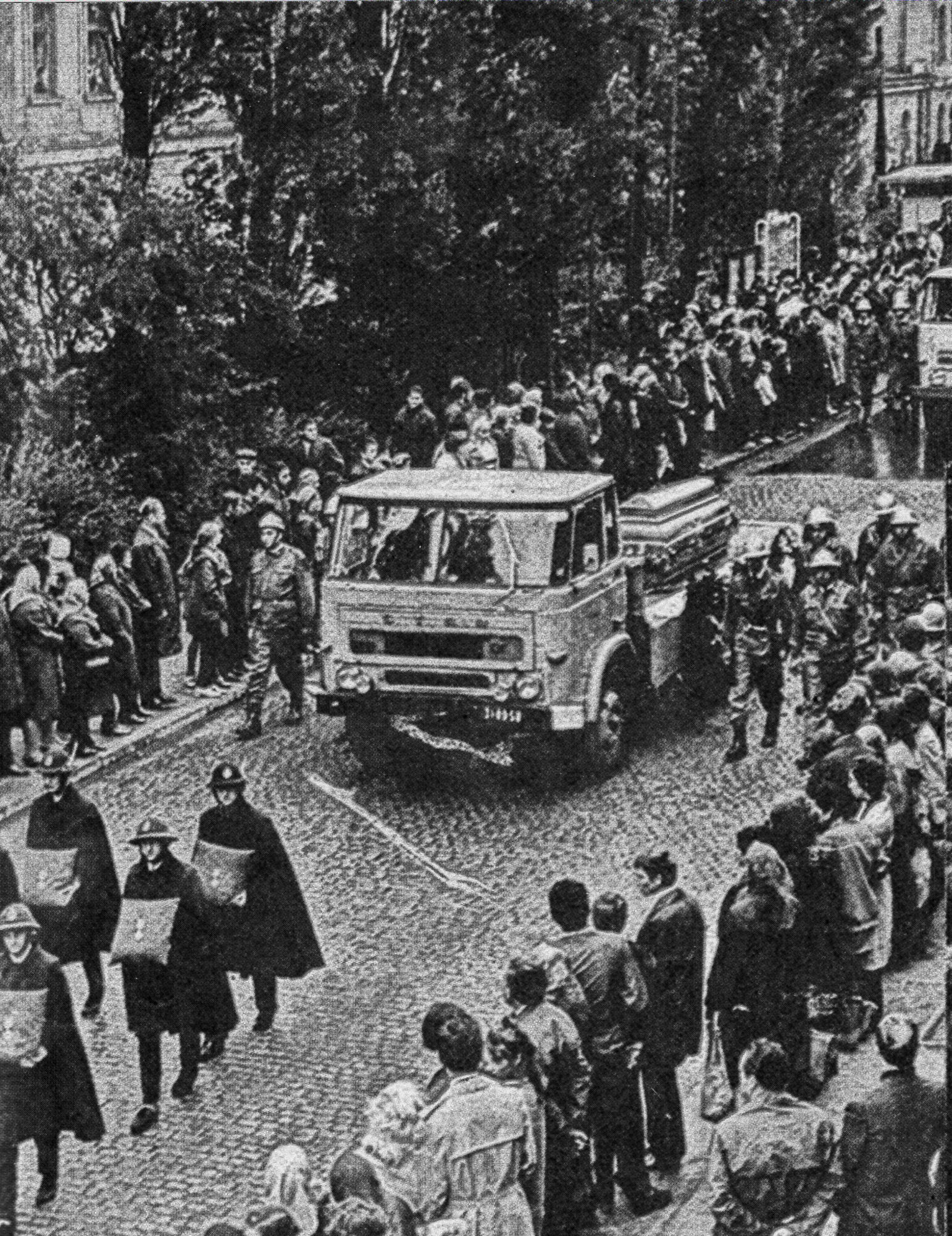 1971 , Fragment konduktu pogrzebowego ofiar pożaru, który przeszedł ulicami miasta/źr. 110 lat społecznej dzialalności OSP Czecchowice Fr.WaloszczykSkomentuj zdjęcie |