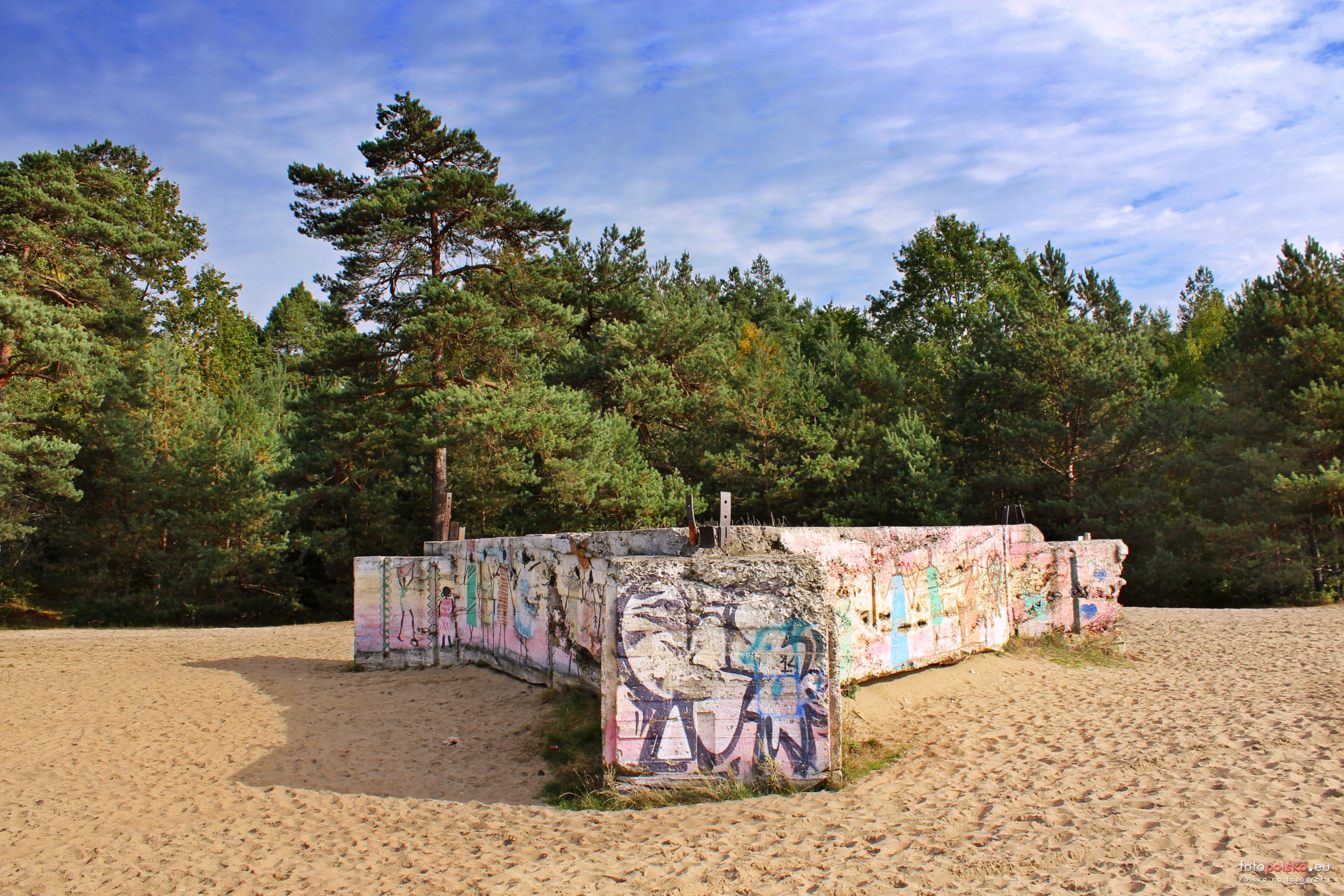Ściany pokryte są "afrykańskim" graffiti na jednym z trzech zachowanych bunkrów. W okresie międzywojennym obszar ten wykorzystywali do ćwiczeń polscy lotnicy na słynnych samolotach "Karaś", oraz piechota i artyleria Okręgu Korpusu Nr V w Krakowie, a w czasie II wojny światowej Pustynia Błędowska służyła jako poligon niemieckiej Afrika Korps oraz niemieckim lotnikom z bazy Udetfeld koło Siewierza. Stąd zapewne pomysł na takie obrazki.