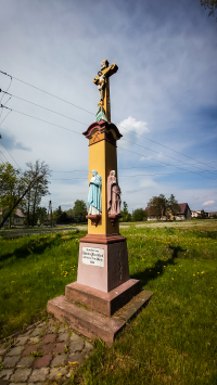 0 pobrań 378 odsłon 6 średnia ocen Poprzednie i następne zdjęcia Andrzej G Obiekty widoczne na zdjęciu Krzyż przydrożny Boża Męka więcej zdjęć (4) Atrakcja turystyczna Krzyż przydrożny Boża Męka z roku 1868. U podstawy krzyża na ścianie frontowej tabliczka z napisem "Gewidmet von Valentin [Marolchok?] und deiner Frau Maria 1868". Na cokole widoczne trzy figury w formie płaskorzeźby. Na ścianie frontowej figura Matki Boskiej. Na ścianie lewej figura Św. Jana Ewangelisty. Na prawej ścianie figura św. Franciszka. U podstawy krzyża klęcząca bokiem do krzyża figura przedstawiająca Marię Magdalenę. ul. Wiejska więcej zdjęć (95) |