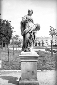 Rzeźby powstały w III ćwierci XVIII wieku oraz na początku XIX wieku w warsztatach między innymi Jana Jerzego Plerscha, Franciszka Ksawerego Deybla, Jana Jerzego Donata czy Józefa Vinache’a, początkowo mogło ich być nawet siedemdziesiąt. Barokowe i rokokowe rzeźby były pierwotnie pozłacane i przedstawiały różne pojęcia, żywioły, sztuki i nauki. W XIX wieku zostały wywiezione do Rosji, ale wkrótce odtworzono je jako kamienne.