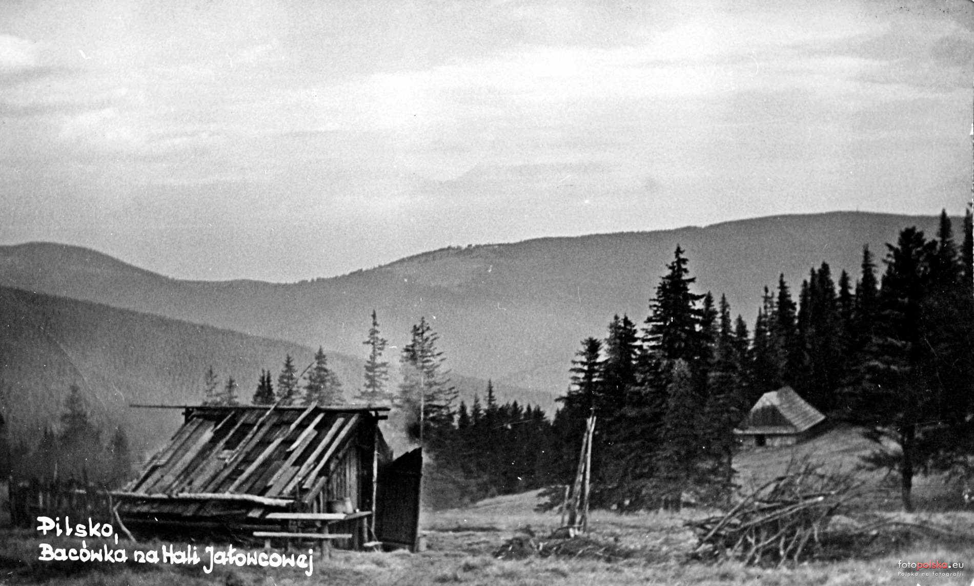 Lata 1950-1955 , Bacówka na Hali Jodłowcowej z widokiem na Romankę.Skomentuj zdjęcie