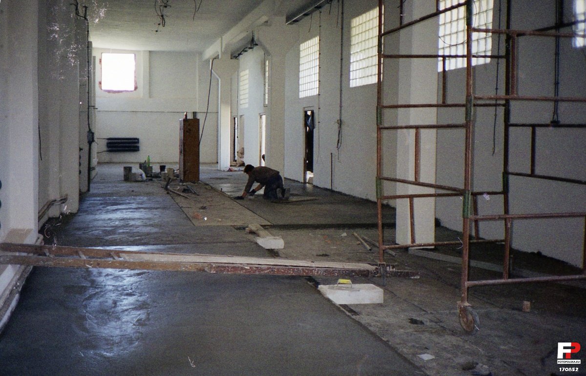 czerwiec 1990 , Dawny budynek warsztatowy nieistniejącej już firmy Prefabet-Wrocław w trakcie adaptacji na drukarnię: widok hali produkcyjnej. Długi prostokąt widoczny wzdłuż hali na podłodze pośrodku to górna powierzchnia solidnie uzbrojonego żelbetowego fundamentu pod maszynę.Skomentuj zdjęcie |