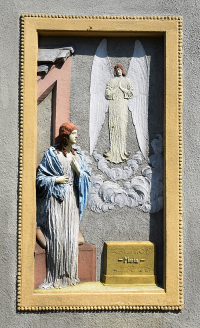14 sierpnia 2020 , Kościół Narodzenia NMP - płaskorzeźba przedstawiająca scenę zwiastowania NMP. |
