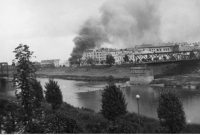 1941 , Płonące budynki nad Sanem w Przemyślu. Widok ogólny. Widoczny zniszczony most.Skomentuj zdjęcie |