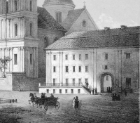 1 pobranie 973 odsłony 6 średnia ocen Poprzednie i następne zdjęcia TristanT Obiekty widoczne na zdjęciu Batorówka (Pałac Sapiehów) więcej zdjęć (3) Architekt: Giovanni Battista Gisleni Zbudowano: 1640 Dawniej: Pałac Sapiehów, Pałac Brzostowskich, Pałac Trybunalski Pierwszy pałac zbudowany został w tym miejscu po 1579 roku. Podczas gdy w 2 połowie XVI wieku przebudowywany był Stary Zamek w Grodnie, swoją rezydencję miał w nim mieć król Stefan Batory (stąd nazwa „Batorówka”). Legenda głosi, że król zmarł w tym budynku. Gmach ten miał plan litery L. Od strony dziedzińca oba człony budowli miały krużganki: część główna na parterze i pierwszy piętrze - pięcioarkadowy, część boczna tylko na parterze - czteroarkadowy. Następnie pałac został rozbudowany w 1 połowie XVII wieku i być może przy jego budowie brał udział Giovanni Battista Gisleni z kręgu architektów dworu króla Władysława IV Wazy. Wskazuje na to ukształtowanie obszernego westybulu i monumentalnych dwuskrzydłowych schodów pod piętrową loggią od strony dziedzińca, które swoją formą nie miały analogii w żadnym pałacu z terenów Rzeczypospolitej połowy XVII wieku. W czasie, gdy pałac należał do wojewody Michała Józefa Sapiehy apartamenty w czasie Sejmu zajmował tu król August II Mocny. Do czasu ukończenia budowy Nowego Pałacu w drugim pałacu Sapiehów na tyłach ich pałacu od strony rynku odbywały się sejmy (w specjalnie zbudowanej Sali Sejmowej od strony obecnej ul. Marksa) oraz posiedzenia Senatu. Z Batorówką stojącą od strony rynku znajdujący się na tyłach Pałac Sapiehów był połączony dwoma drewnianymi piętrowymi łącznikami z pomieszczeniami dla dworu. W roku 1726 dostawiono do pałacu zaprojektowany przez Joachima Daniela Jaucha drewniany pięcioprzęsłowy krużganek łączący nad ulicą zespół pałacowy z kościołem Jezuitów. Senatorowie, posłowie i publiczność wchodzili do gmachów sejmowych od strony ulicy Brygidzkiej (obecnie Marksa). Sejm w nowych budynkach na tyłach pałacu Sapiehów odbył się w terminie od 3 października do 17 listopada 1718 roku. W 1775 roku w budynku miał posiedzenia Trybunał Główny Wielkiego Księstwa Litewskiego. W końcu XVIII wieku pałac kupił podskarbi Michał Brzostowski i następnie był własnością jego potomków. Rosjanie skonfiskowali im pałac w roku 1832 po powstaniu listopadowym. Po pożarze w roku 1885 budynek odbudowano tylko częściowo. W 2 połowie XIX wieku przebudowano lewe skrzydło (od strony kościoła) nadając mu wyraz eklektyczny. Skrzydło prawe, przez pewien czas mające jeszcze barokową formę, zostało całkowicie zniszczone w czerwcu 1941 roku podczas niemieckiego bombardowania. Obecnie w ocalałej części przebudowanego pałacu mieści się Akademia Medyczna i budynek niczym się nie wyróżnia spośród otaczającej go zabudowy. Źródło: Autorzy: Licencja: [ CC-BY-SA 3.0] ul. Маркса Карла więcej zdjęć (61) Dawniej: Brygidzka, Kupiecka |