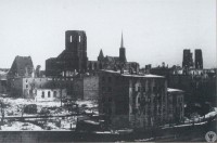 Lata 1945-1948 , "Widok na Wyspę Piasek, zrujnowany Instytut Europy Wschodniej oraz wypaloną wieżę kościoła Najświętszej Marii Panny."