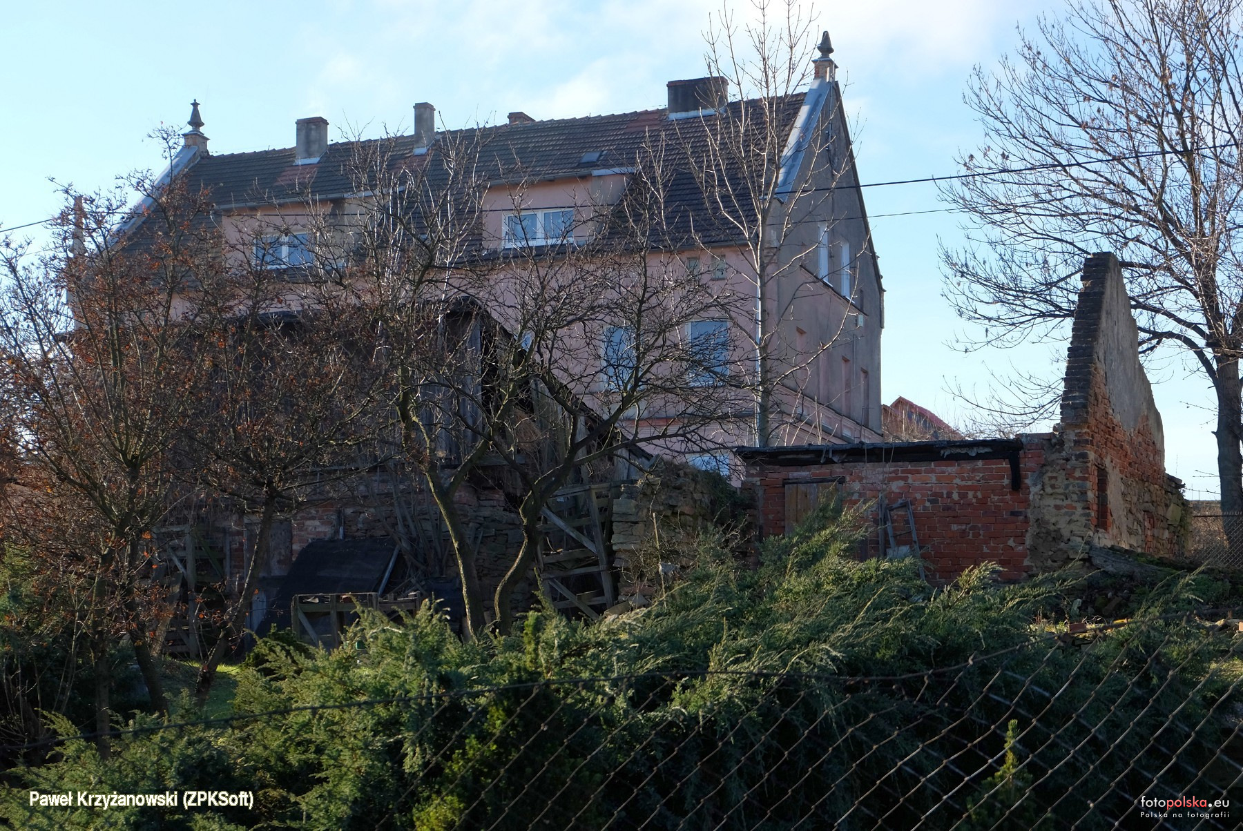 20 grudnia 2020 , Gościęcice 108 - ruina budynku na terenie posesji. Za nim wyższy dom przy Gajowej 14.Skomentuj zdjęcie |