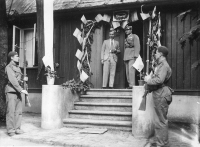 sierpień 1933 , Po przelocie nad Atlantykiem. Kpt. pil. Stanisław Skarżyński - zdobywca Atlantyku - oraz kpt. pil. Franciszek Witakowski - komendant lotniska Lublinek - w drzwiach udekorowanego budynku na Lublinku. Honorową wartę pełnią junacy Przysposobienia Wojskowego LotniczegoSkomentuj zdjęcie