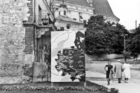 Lata 1940-1944 , Fragment zabudowy Rynku. Widoczna mapa działań wojennych na wschodzie. W tle dach kościoła.Skomentuj zdjęcie |