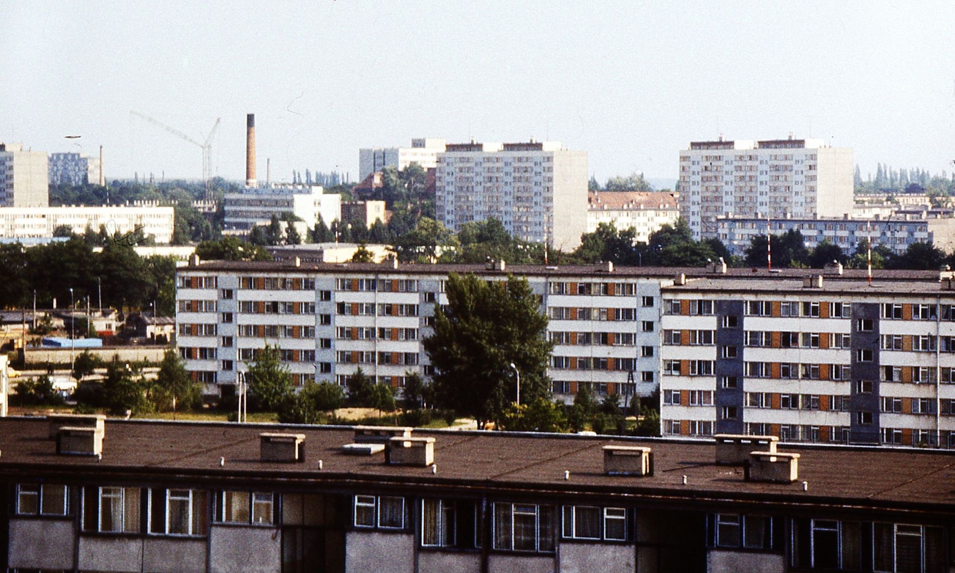 1981 , Byłem do dziś pewien, że kiedyś już to ujęcie umieściłem, ale wszystko wskazuje na to, że jakoś mi to umknęło. Na tym zdjęciu wykonanym w 1981 roku z wysokiego piętra budynku przy Lubuskiej 1-3 widoczne są: na najbliższym planie dach i najwyższa kondygnacja budynku przy ul. Stysia 24-69 (zwanego czasem "Jamnikiem"), dalej dwa bliźniacze pięciokondygnacyjne bloki przy ul. Zielińskiego 63-75 (ten bliższy, bardziej z prawej) oraz Zielińskiego 78-90 (ten dalszy, pośrodku kadru); za tym dalszym widać baraki i jakąś bazę, chyba transportową, nie pamiętam dokładnie co tam było. Te dwa niemal identyczne wysokie bloki w oddali, to o ile dobrze rozpoznaję Wielka 53-59 (ten pośrodku) i Drukarska 2-8 (ten z prawej). Komin natomiast należał do kotłowni przedwojennego szpitala, w budynkach którego obecnie mieści się Akademia Ekonomiczna (dawna kotłownia to o ile się nie mylę dzisiejsze archiwum, budynek "K" tej Akademii). Ten biały wysoki blok na prawo od komina to natomiast DS "Ślężak".