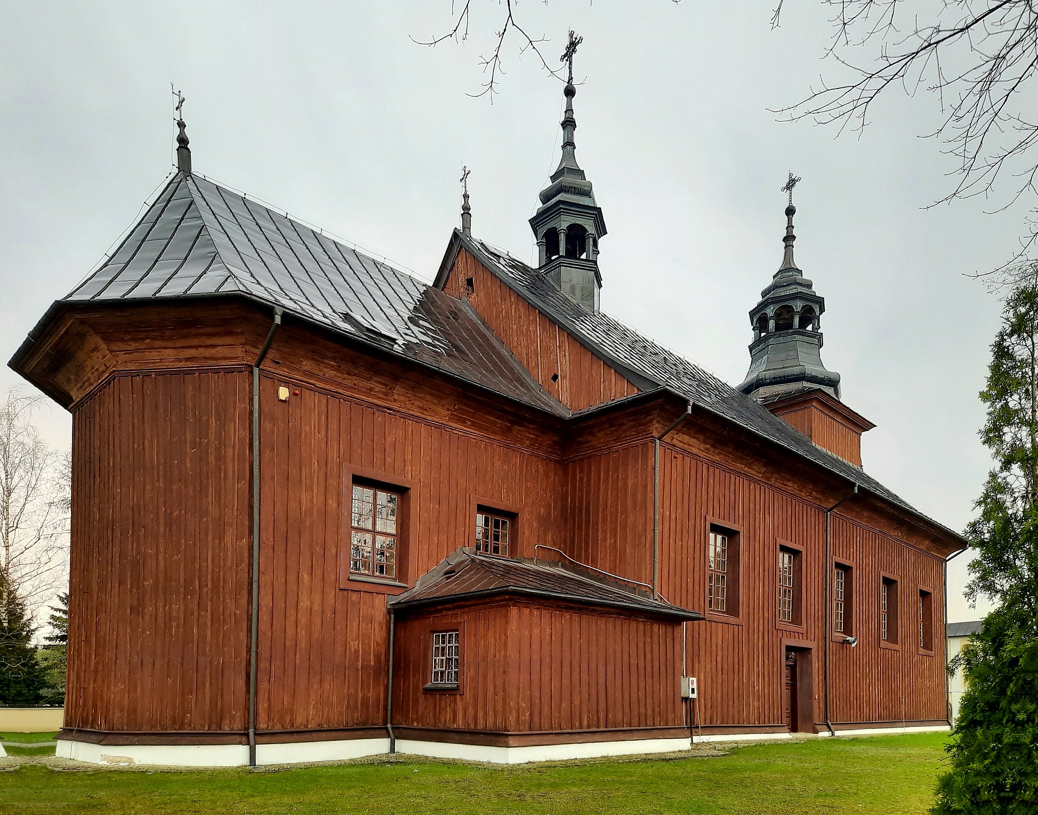 Kościół św. Stanisława więcej zdjęć (19) Atrakcja turystyczna Zbudowano: 1768 Zabytek: A/71 z 26.11.1966 Kościół p.w. Świętego Stanisława Biskupa z 1768 r. Zbudowany z fundacji Jana Jakuba Zamoyskiego wojewody podolskiego. Rozbudowany w latach 1897 – 98 – przedłużenie nawy i dobudowa wieży. Remontowany w 1927 r. – boazerie wewnętrzne. W 1968 r. ks. Kardynał Karol Wojtyła przekazał do kościoła autentyczne relikwie Świętego Stanisława w postaci części kości. W 1975 r. zamiana gontu na dachach na blachę. Kościół drewniany, trójnawowy konstrukcji zrębowej. Nie orientowany, zbudowany z drewna modrzewiowego. Mniejsze prezbiterium od nawy, zamknięte trójbocznie z dwoma bocznymi zakrystiami. Wieża nadbudowana nad nawą. Zwieńczona blaszanym hełmem z latarnią. Dach dwukalenicowy, kryty blachą z wieżyczką na sygnaturkę. Zwieńczoną hełmem blaszanym z latarnią. Wnętrze obite boazerią i podzielone na trzy nawy przez dwa rzędy słupów po pięć sztuk z arkadami. Pozorne stropy kolebkowe, niższe w nawach bocznych. Belka tęczowa z barokowym krucyfiksem z poł. XVIII w. Chór muzyczny wsparty na dwóch słupach z organami z 1906 r. Wyposażenie rokokowe z lat 1769 – 79 autorstwa snycerzy Jana i Jakuba Maucherów: ołtarz główny i dwa boczne, ambona drewniana z rzeźbami czterech Ewangelistów., konfesjonał i chrzcielnica. Na wewnętrznych ścianach kościoła tablice ku czci żołnierzy 1 artylerii konnej, poległych w okolicach 23 – 26 września 1939 r. i partyzantów AK z oddziału Michała Wysockiego „Wita", którzy obronili świątynię i wieś przed spaleniem w lipcu 1944 r. Dzwonnica murowana, arkadowa z 1787 r. z trzema dzwonami z 1906 r. w ogrodzeniu w postaci muru z bramką i czterema kapliczkami z XVIII w. Plebania murowana z p. XX w. za : |