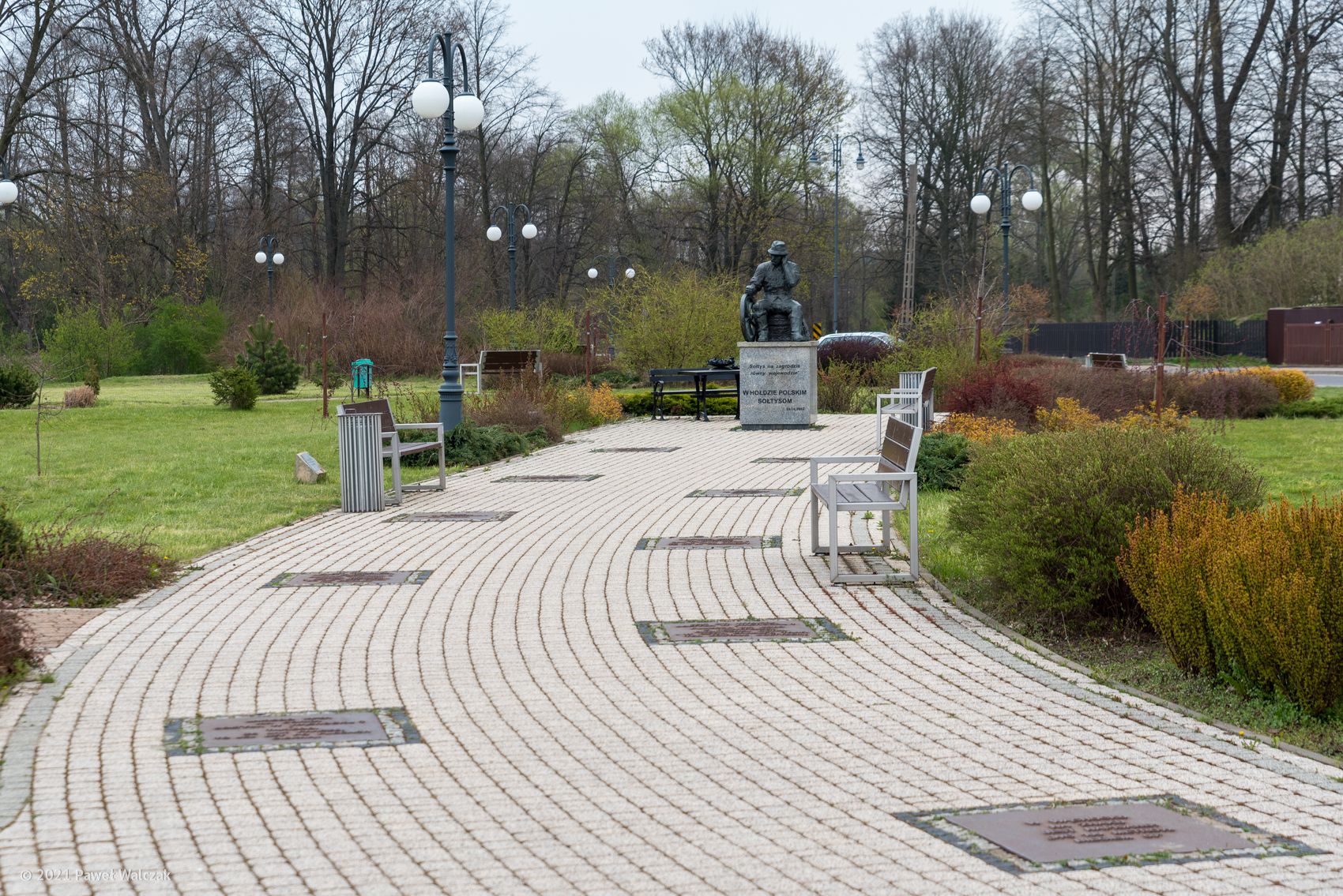 1 maja 2021 , Aleja prowadząca do pomnika sołtysa, z metalowymi tablicami upamiętniającymi żarty o WąchockuSkomentuj zdjęcie