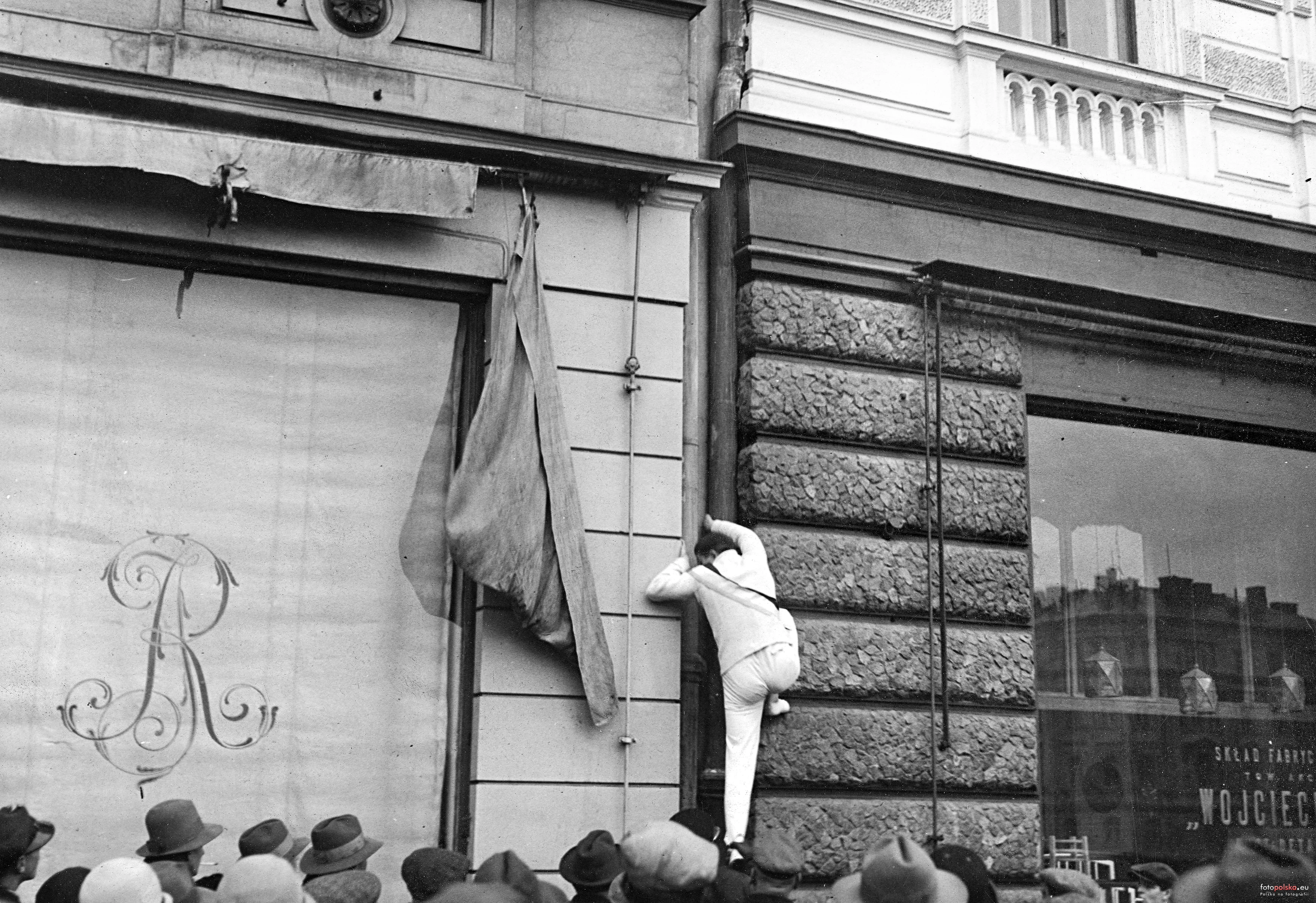 Lata 1928-1929 , "Człowiek Mucha" - Feliks Nazarewicz wspinający się po budynku przy Ossolińskich - międzywojenny akrobata, który sławę zdobył wspinając się po elewacjach budynków. Zanim rozpoczął wspinaczkę, informował o tym miejskie władze, a dzięki zapowiedzi wyczynu na miejscu zdarzenia gromadziły się tłumy gapiów. Dość często okoliczne uliczki były zamykane, a od widzów była pobierana opłata. Zazwyczaj swoją wspinaczkę kończył efektownym skokiem w dół na płachtę trzymaną przez strażaków.Skomentuj zdjęcie