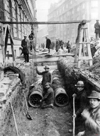 1928 , "Opuszczanie podwójnych rur kablowych 19 - otworowych przy pomocy kobylic i osadzanie ich w wykopie. |