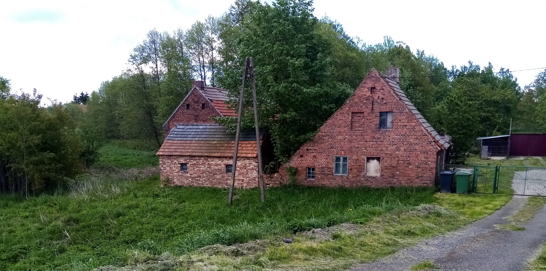 23 maja 2021 , Budynki dawnego gospodarstwa. Dach budynku mieszkalnego już częściowo się zawalił. Na prawo od kadru stoi współczesny budynek.Skomentuj zdjęcie |