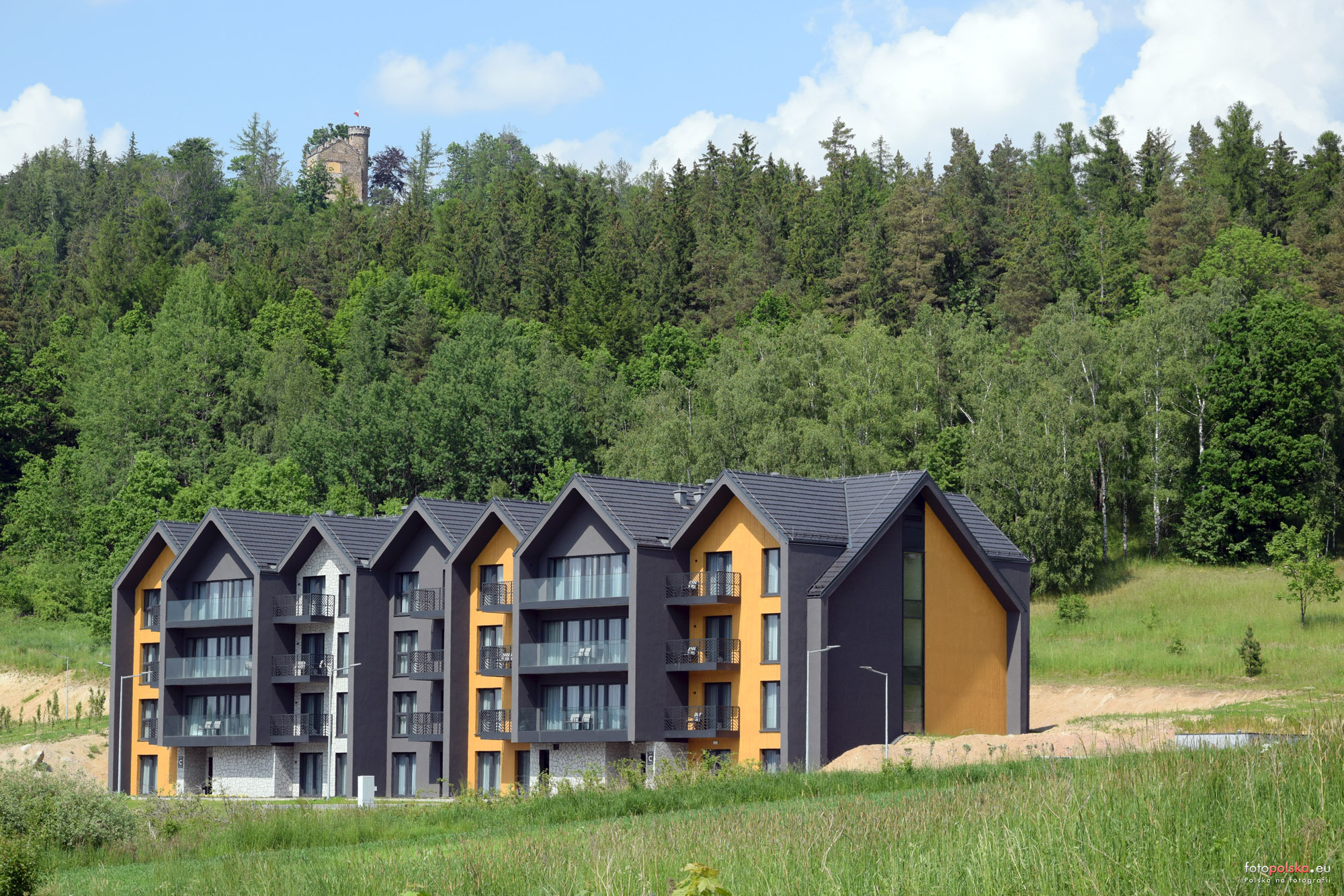7 czerwca 2021 , Sosnówka, nowy budynek przy Tyrolskiej 2H, w górze widoczny zamek księcia Henryka.Skomentuj zdjęcie