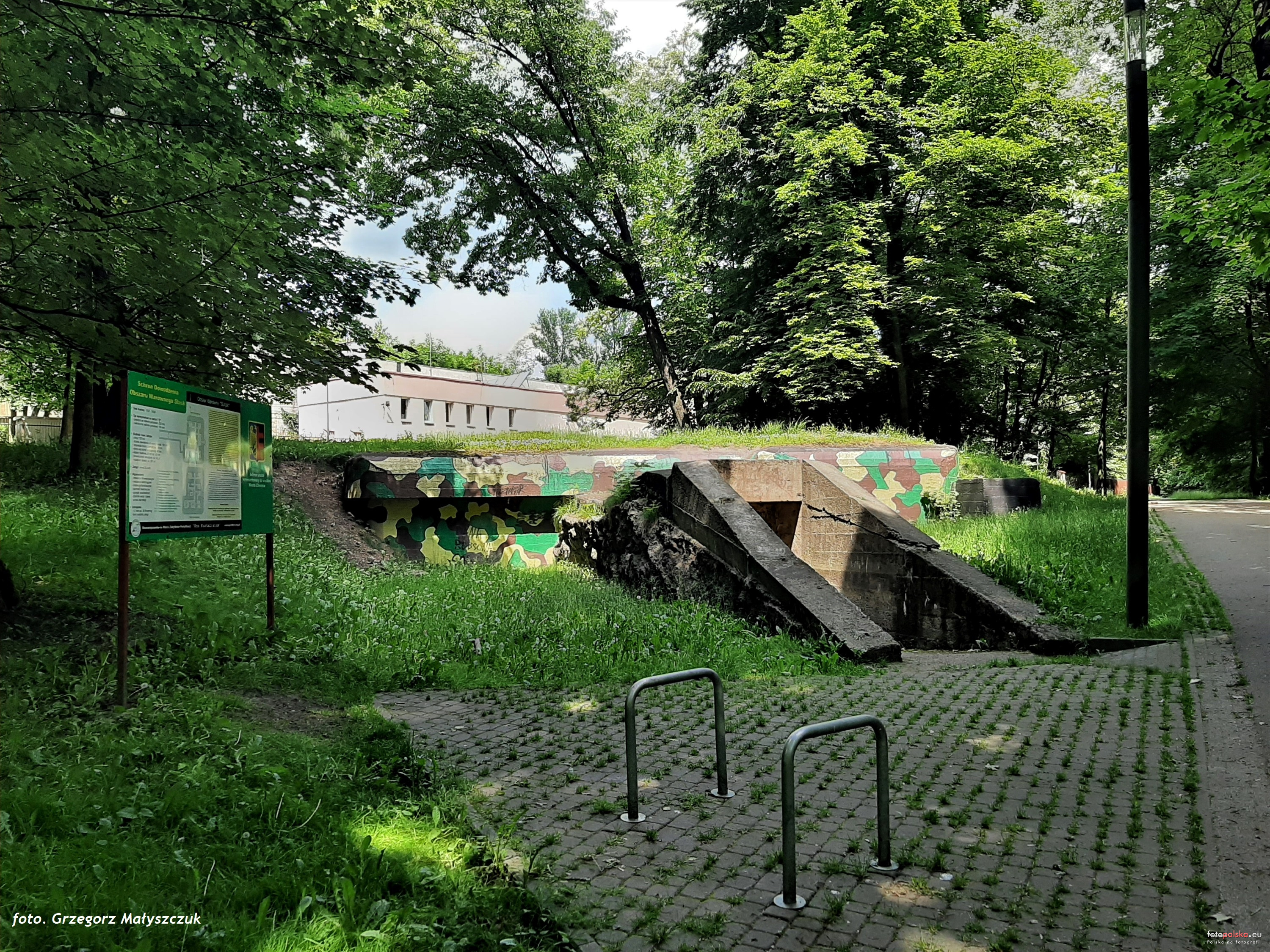 Schron dowodzenia został wzniesiony w roku 1938 dla sztabu Grupy Operacyjnej "Śląsk", na którą składały się między innymi obsady fortyfikacji Obszaru Warownego. Jest to obiekt dwukondygnacyjny z wysuniętym skrzydłem ściany tylnej o charakterystycznie zaokrąglonych narożach ścian i stropu. Wewnątrz ściany narażone i strop dzielący kondygnacje wzmocniono siatką przeciwodpryskową, a wyposażenie nie różniło się od stosowanego w schronach bojowych. Wejście do obiektu prowadziło przez otwór zamykany kratą forteczną i flankowany przez strzelnicę obrony wejścia, a następnie przez dwudzielne drzwi pancerne w załamaniu korytarza. Schron posiada trzy wyjścia ewakuacyjne, dwa ze strzelnicami rkm, które pozwalały na obronę ściany tylnej i zapola schronu. Jedno z wyjść awaryjnych przecina ścianę czołową i wiedzie na zewnątrz przez szyb z klamrami ciekawostką jest rozmiar wyłazu jest o ok. 50% większy niż wyjścia w pozostałych obiektach OWŚ. W celu zapewnienia wygodnej pracy sztabowej obiekt podzielono na szereg pomieszczeń różnego przeznaczenia, a kondygnacje skomunikowane zostały za pomocą schodów. Schron dowodzenia posiadał oświetlenie elektryczne i wentylację wszystkich pomieszczeń. Energię dostarczano z miasta, natomiast niezależność zapewniał agregat prądotwórczy zamontowany w maszynowni, gdzie również znajdowały się zbiorniki paliwa, zbiorniki wody, akumulatory itp. Schron zachowany w nienajlepszym stanie; w wyniku adaptacji na schron OPL, usunięto po wojnie całość oryginalnego wyposażenia, łącznie z elementami wmurowanymi w ścianę; przebudowano niektóre drzwi i przejścia. Brak dostatecznej wentylacji doprowadził do sporego zawilgocenia obiektu, tak więc poważnej korozji uległy nieliczne resztki metalowych elementów. Dzieła zniszczenia dopełnili bezdomni zamieszkujący przez pewien czas w obiekcie - śmieci, ślady ognisk itp. Na szczególną uwagę natomiast zasługuje spory fragment oryginalnego, wrześniowego farbomaskowania, składającego się z 4 kolorów.
