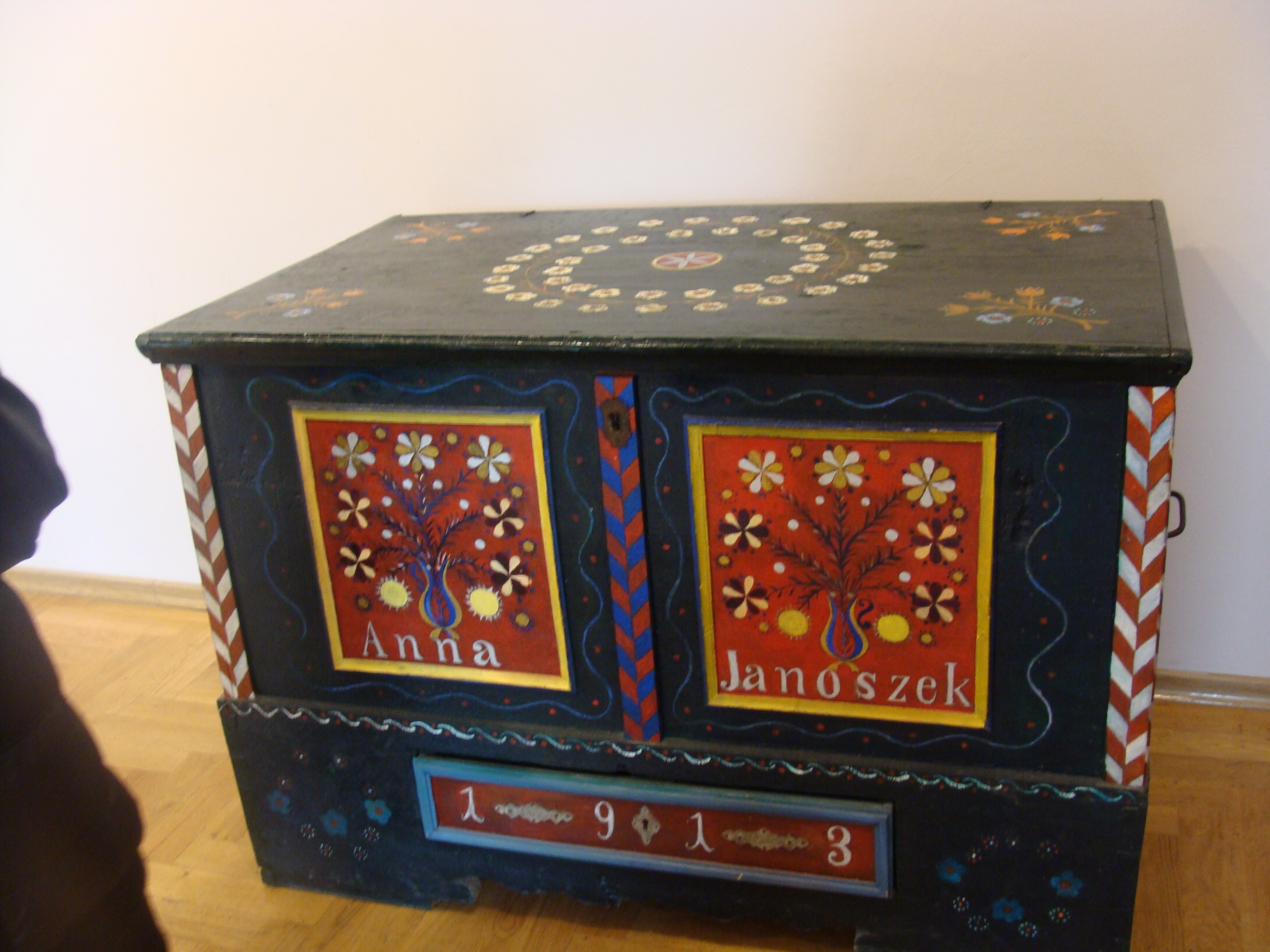 10 lutego 2012 , Jeden z eksponatów dostępnych do zobaczenia na miejscu. Trówła. Anna Janoszek, rok 1913. W takiej skrzyni Panna Młoda trzymała cały swój posag.Skomentuj zdjęcie