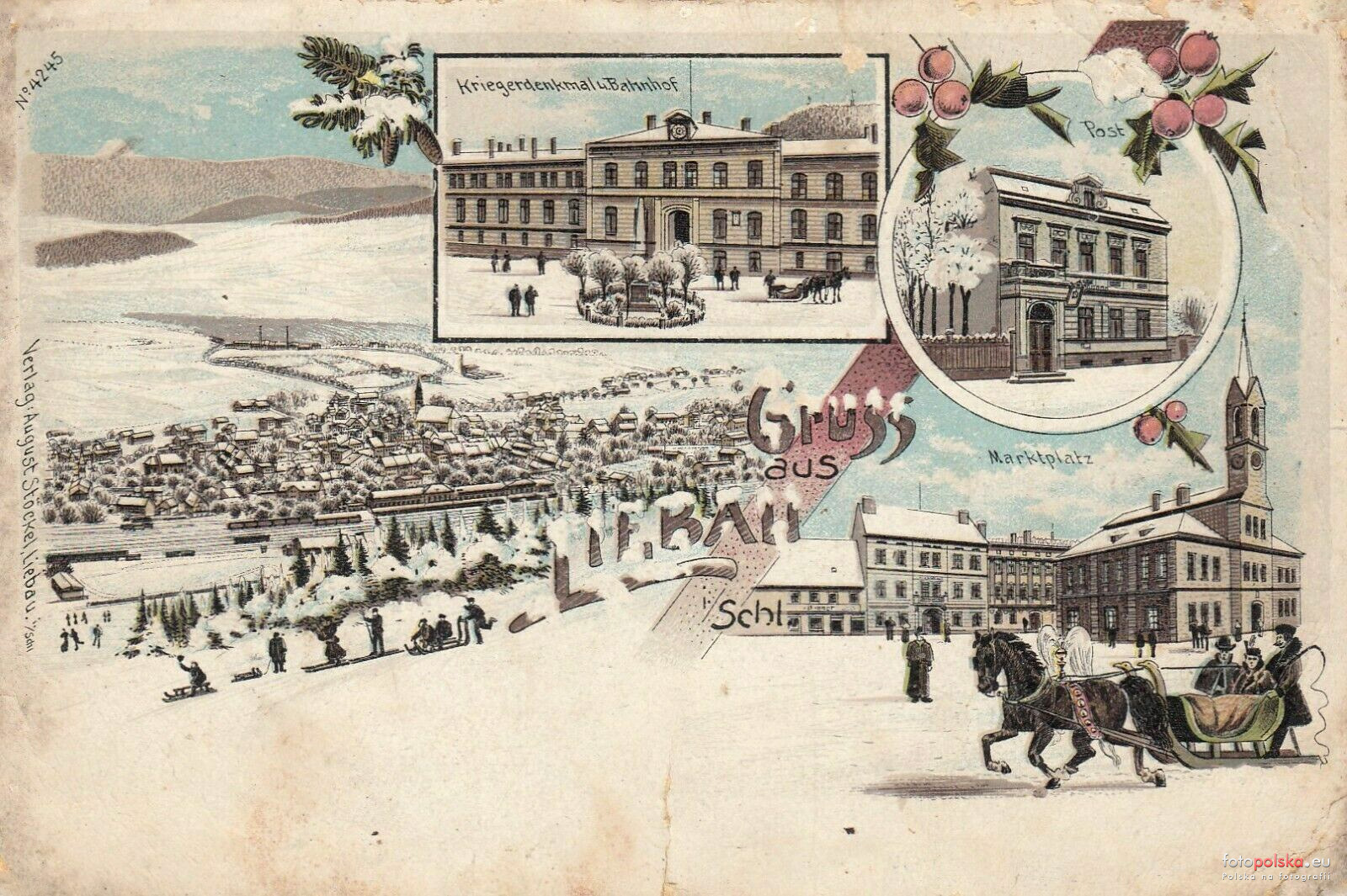 1900 , Zimowe pozdrowienia z Lubawki. Na zdjęciu m.in. Rynek oraz dworzec kolejowy.Skomentuj zdjęcie |